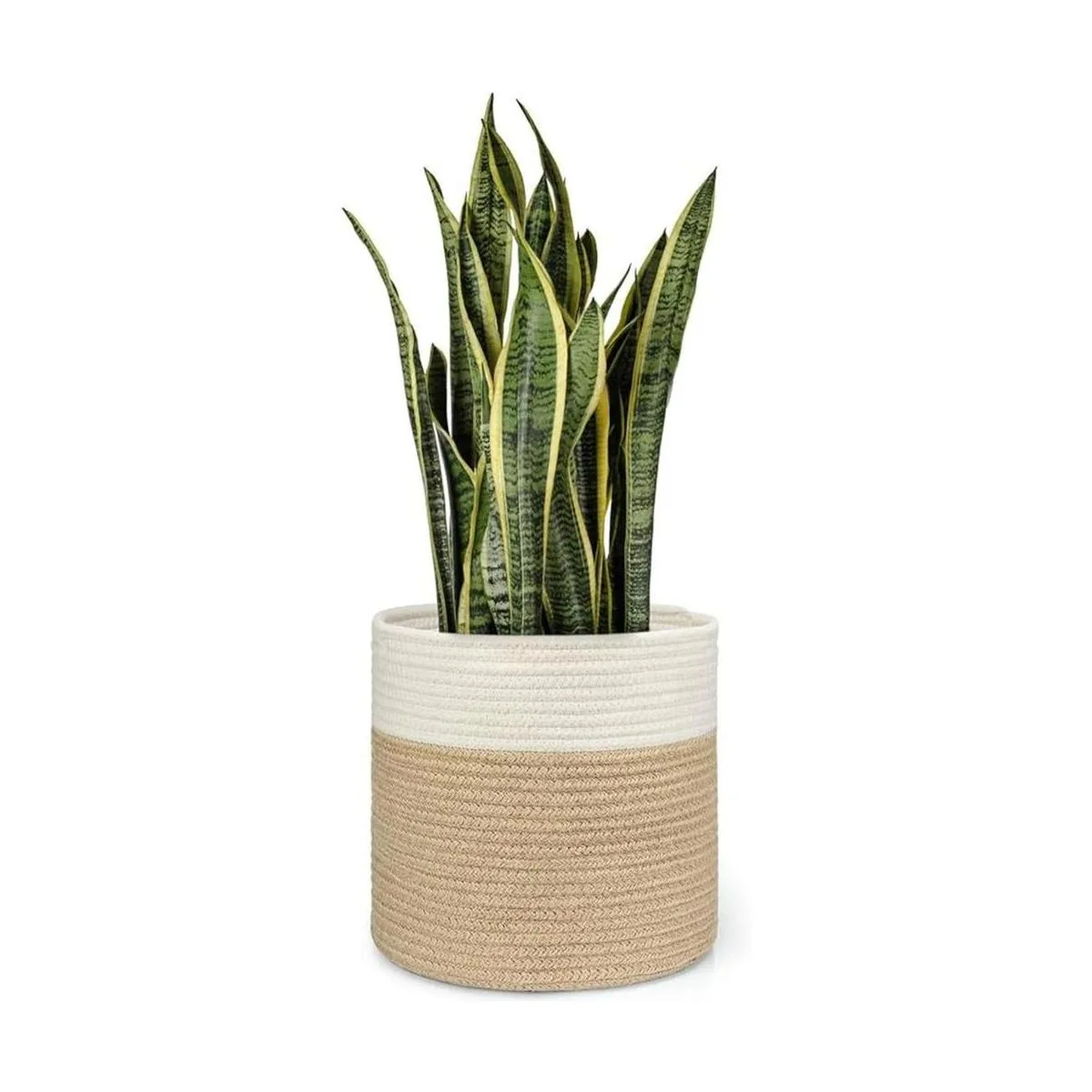 Dahey Cesta de almacenamiento tejida moderna de cuerda de algodón empalmada de yute para macetas de interior de 10 pulgadas, 11 x 11 pulgadas, contenedor decorativo de lavandería con asa, decoración rústica del hogar, blanco y beige