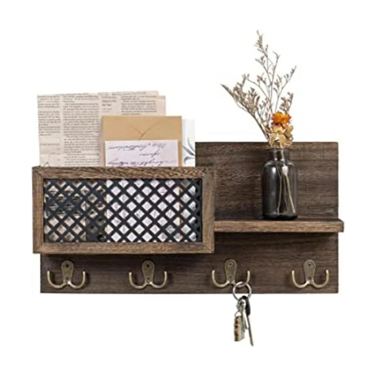 Dahey Soporte de correo montado en la pared, organizador de correo y llaves de madera con 4 ganchos dobles, estante decorativo para entrada, decoración rústica del hogar para entrada, vestíbulo, pasillo, cocina, oficina, bronce