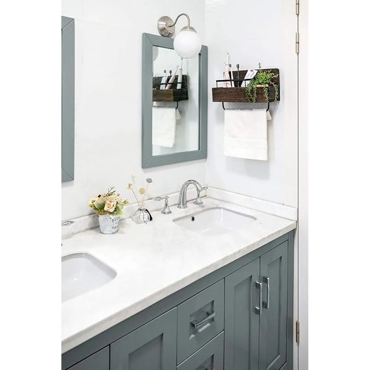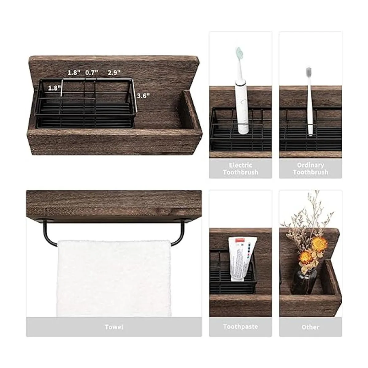 Multifuncional: tiene suficiente espacio de almacenamiento para poner cepillo de dientes, pasta de dientes, afeitadora, limpiador facial, peine, recortador de cejas, todavía puede colgar la toalla debajo del estante. El soporte para cepillo de dientes y el soporte de madera se pueden utilizar por separado, uso para pasta de dientes, peine y otros objetos pequeños.