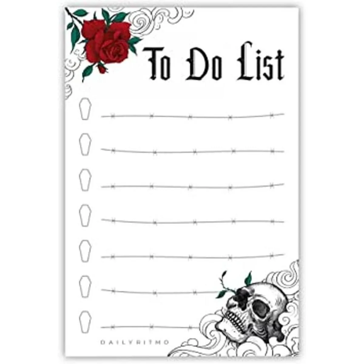 Acerca de: Bloc de notas pegajoso de calavera gótica para tu lista de brujas.