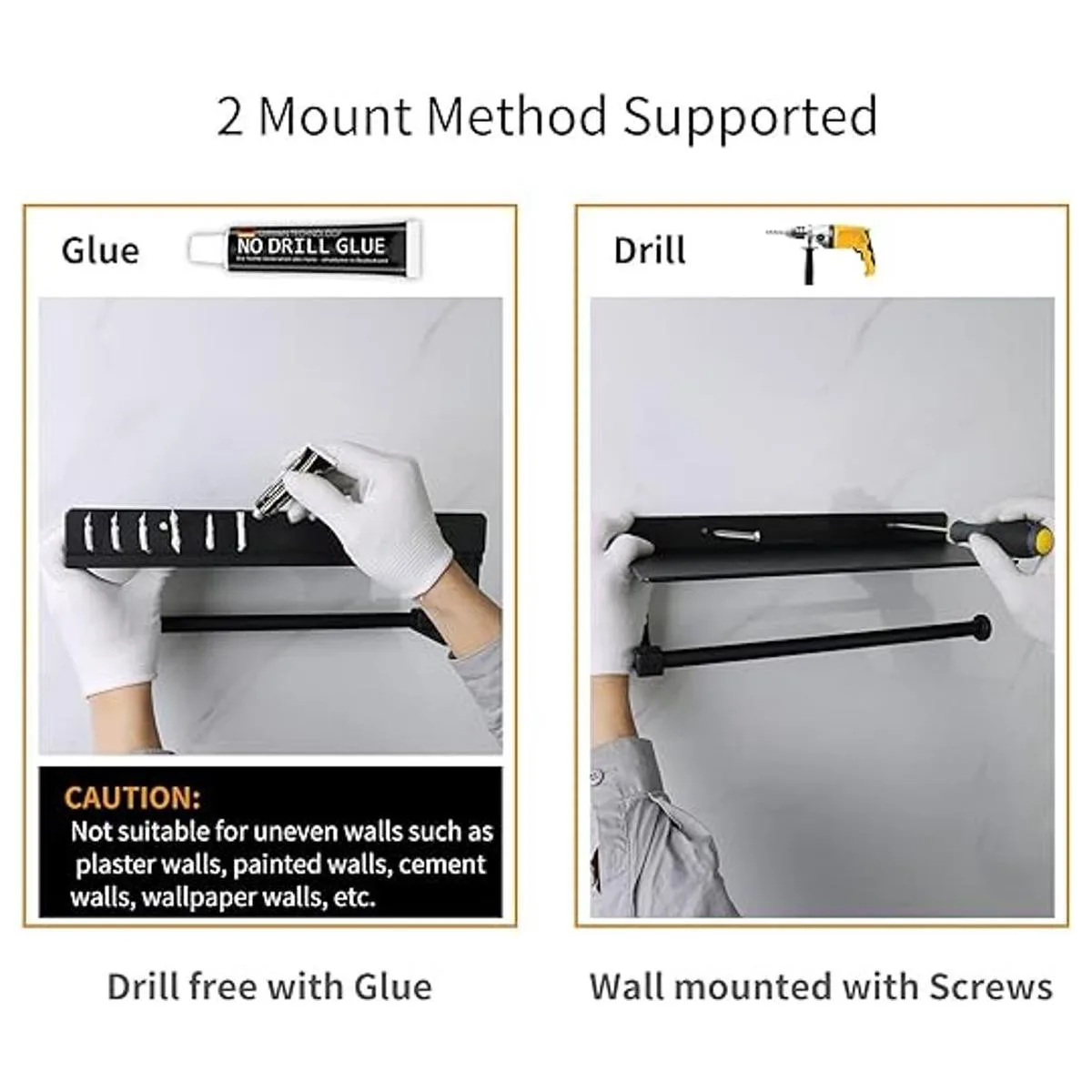Wall mount paper towel holder Two installation methods: screw or glue, convenient and sturdy.