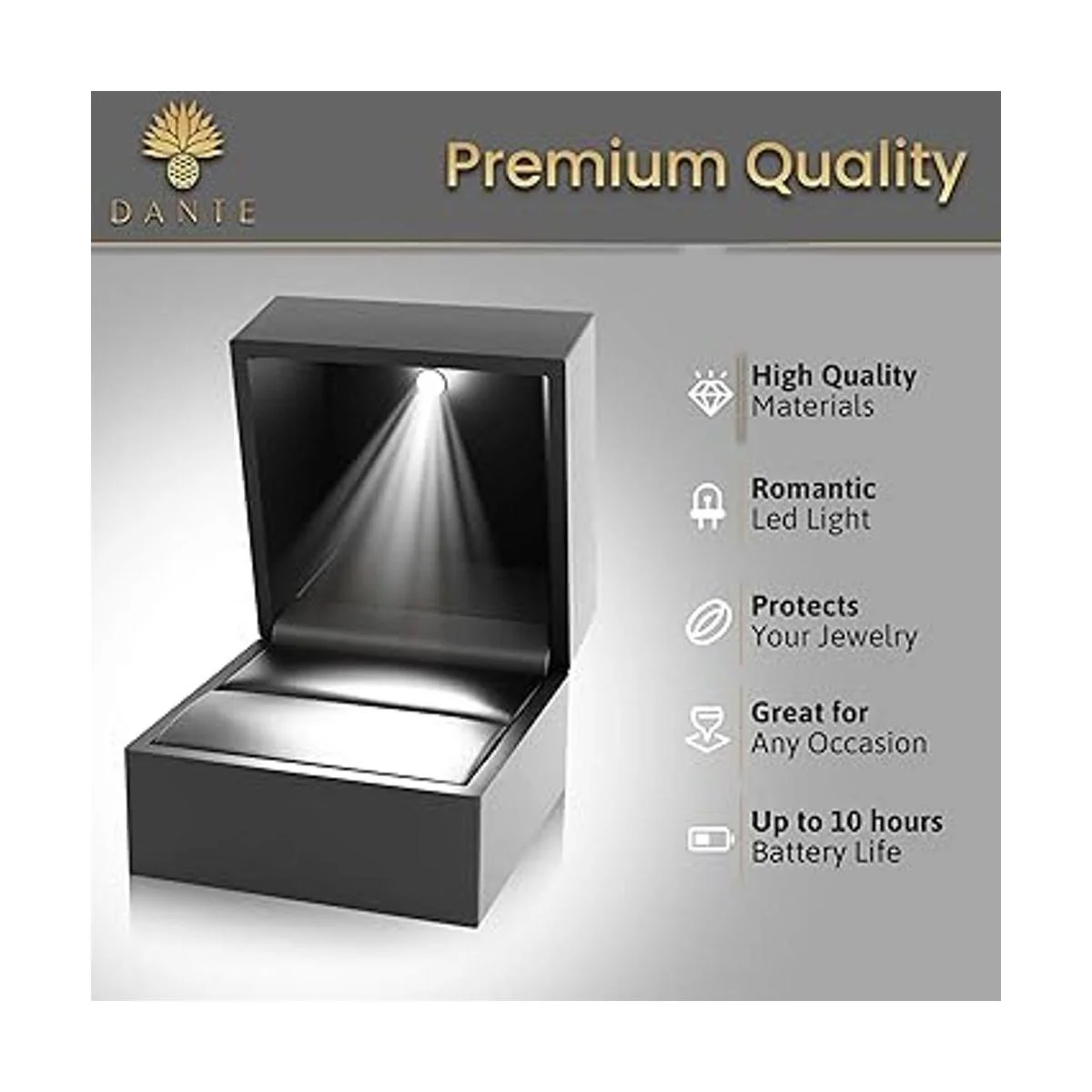 DANTE Caja de anillo de compromiso, caja de anillo de lujo con luz, caja de anillo de boda de terciopelo de felpa, caja automática de anillo de luz LED, caja de anillo de luz negra de alta calidad, ideal para propuestas, aniversario