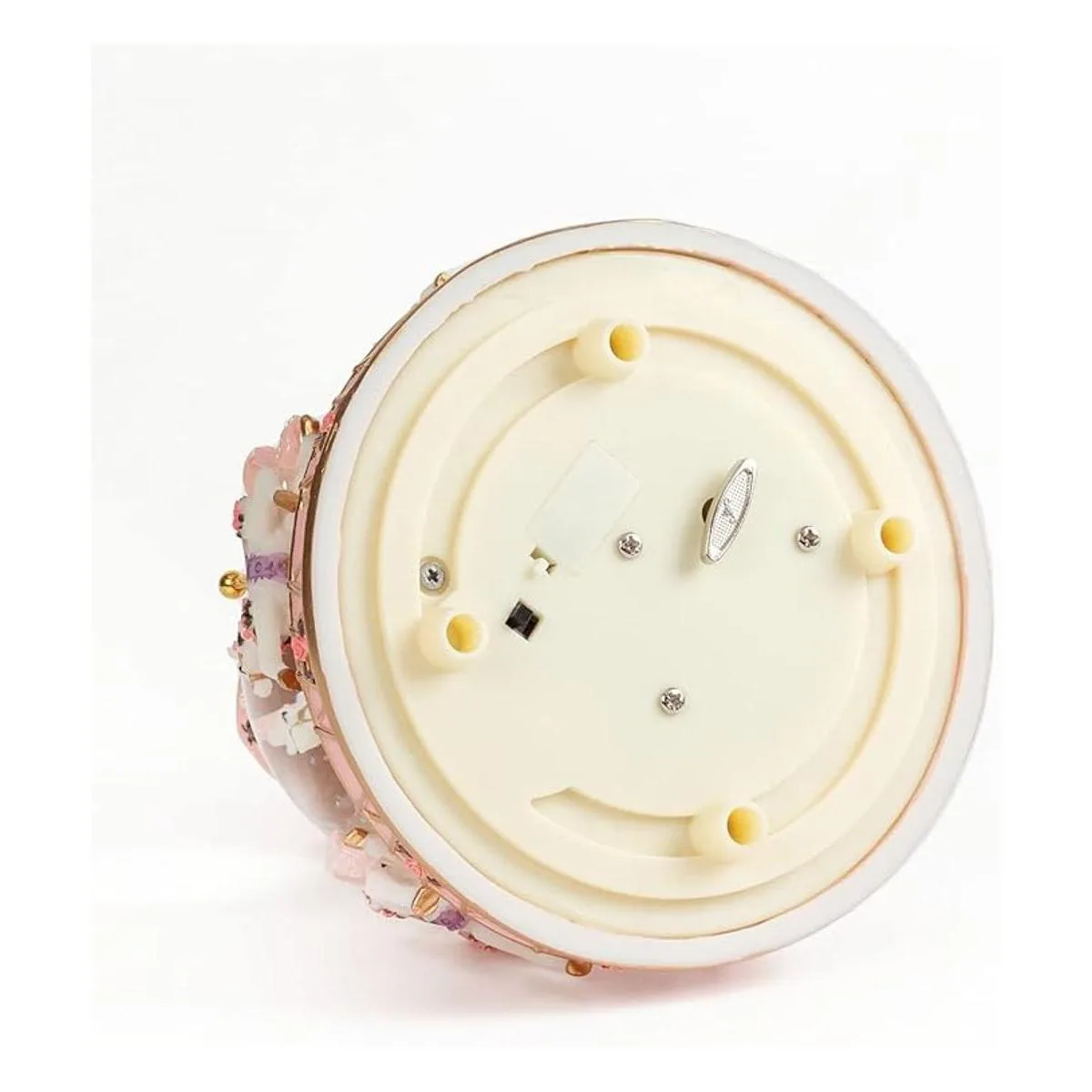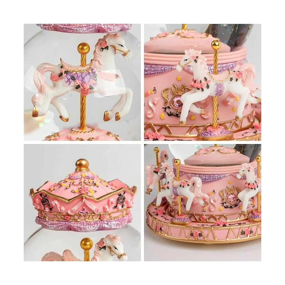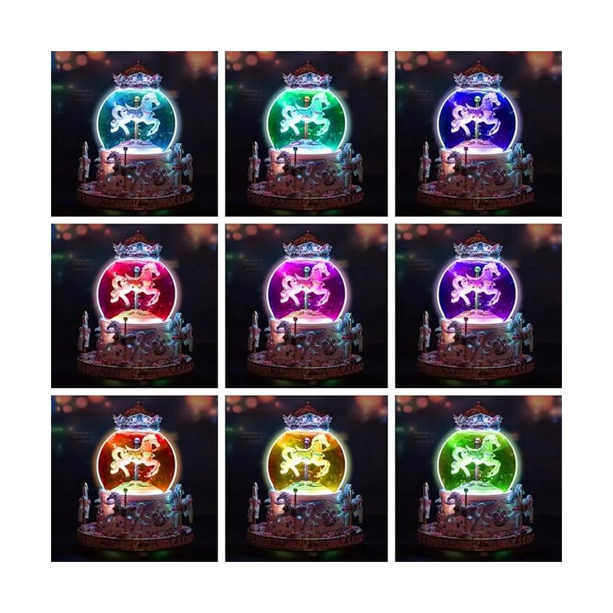 Globo de nieve de carrusel: utiliza la tecla inferior para girar el resorte firmemente, luego suelta y el globo de nieve carrusal estará jugando. Enciende el interruptor, puedes ver las luces coloridas, a medida que se reproduce la melodía, los caballos en el globo de agua y 5 caballos alrededor de la bola de cristal pueden girar con música.