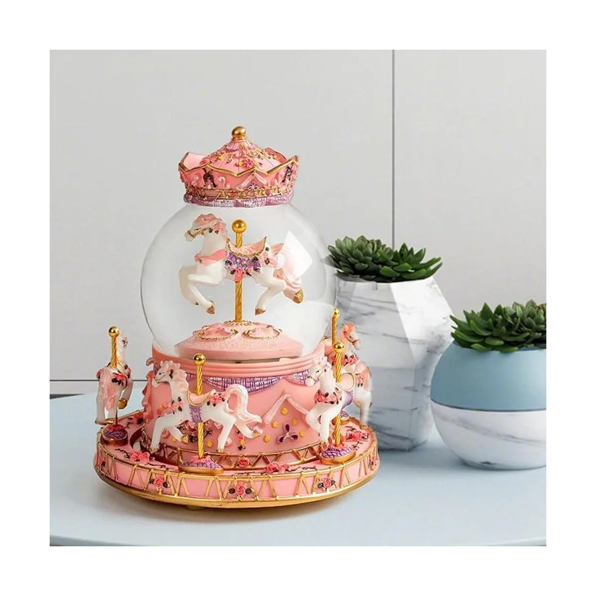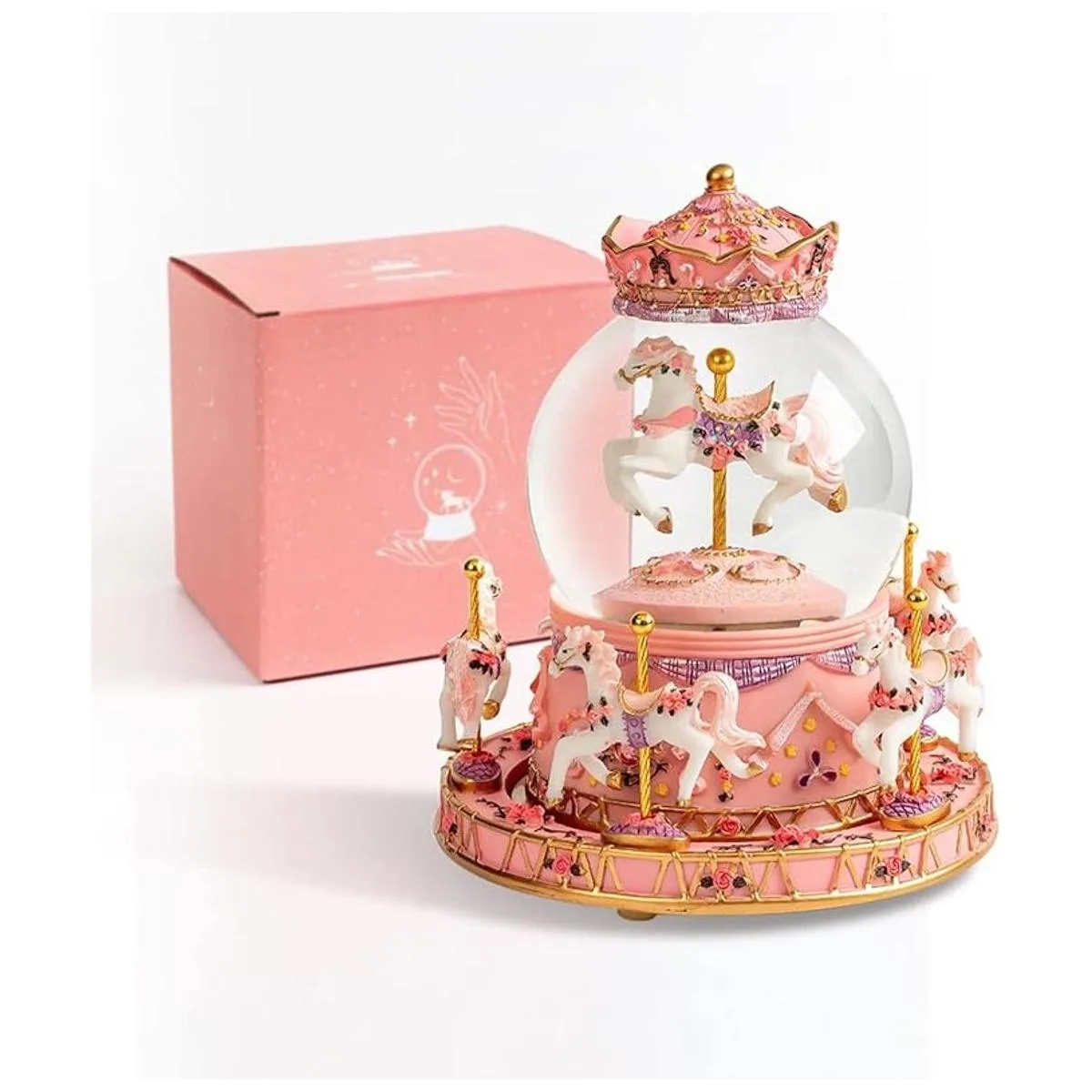 DANVON Caja de música de unicornio con forma de carrusel envuelto en regalo, globo de nieve, luces LED que cambian de color para mujeres, niños, niñas, mamá, hija, nieta, Navidad, regalos de cumpleaños, regalo del día de San Valentín rosa
