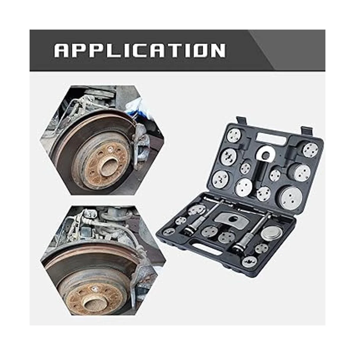 Compatibilidad universal: este juego de herramientas de pinza de freno incluye 2 placas de retención, conjuntos de pernos de empuje izquierdo y derecho, y 18 adaptadores para adaptarse a la mayoría de marcas y modelos de vehículos nacionales e importados y te da todo lo que necesitas para dar servicio a tus pastillas de freno