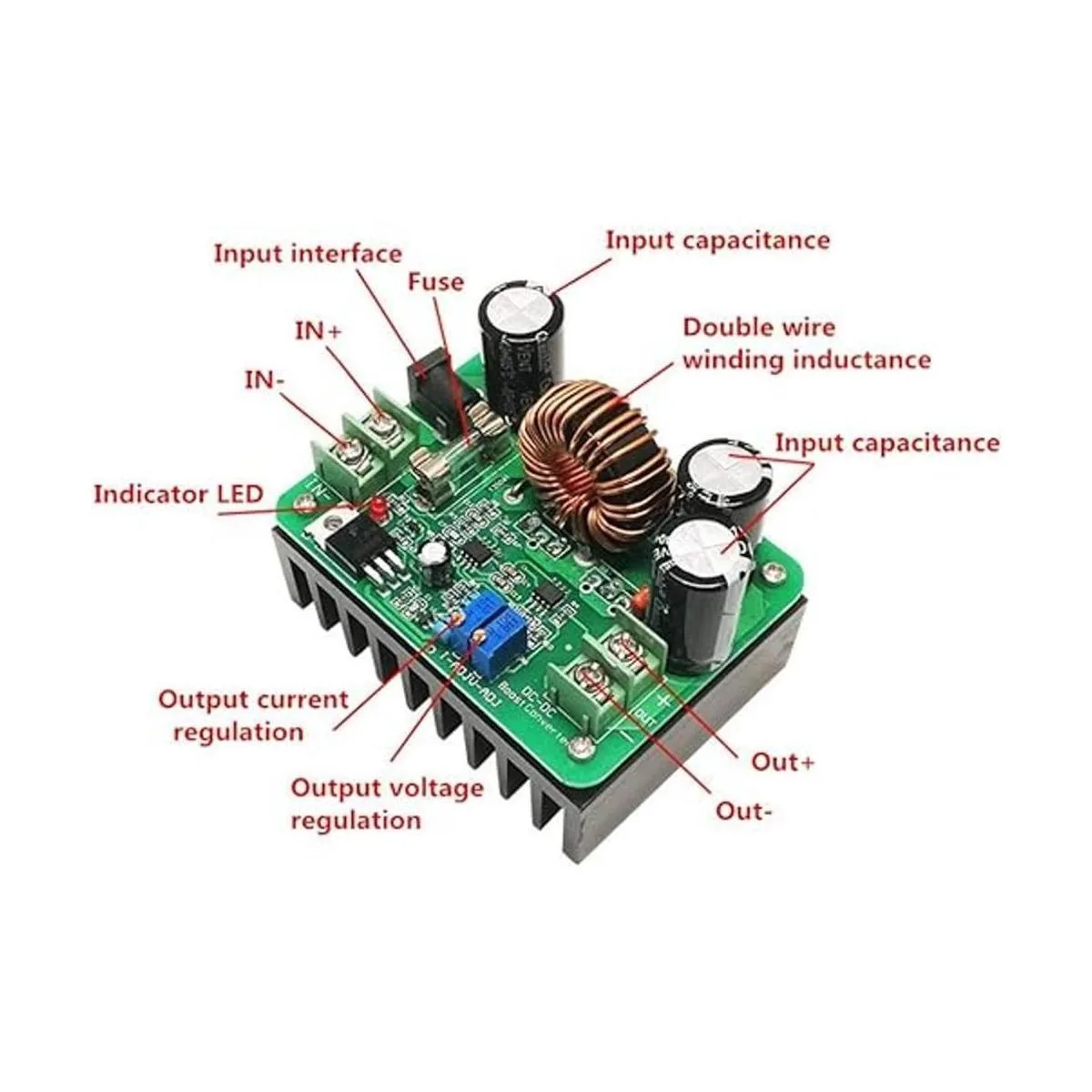 Módulo de elevación de alta potencia de 600 W, entrada de voltaje amplio: 10 V 60 V, 12 V 80 V salida de voltaje ancho ajustable; corriente de salida se puede ajustar; diferencia de presión de entrada y salida ultra baja.