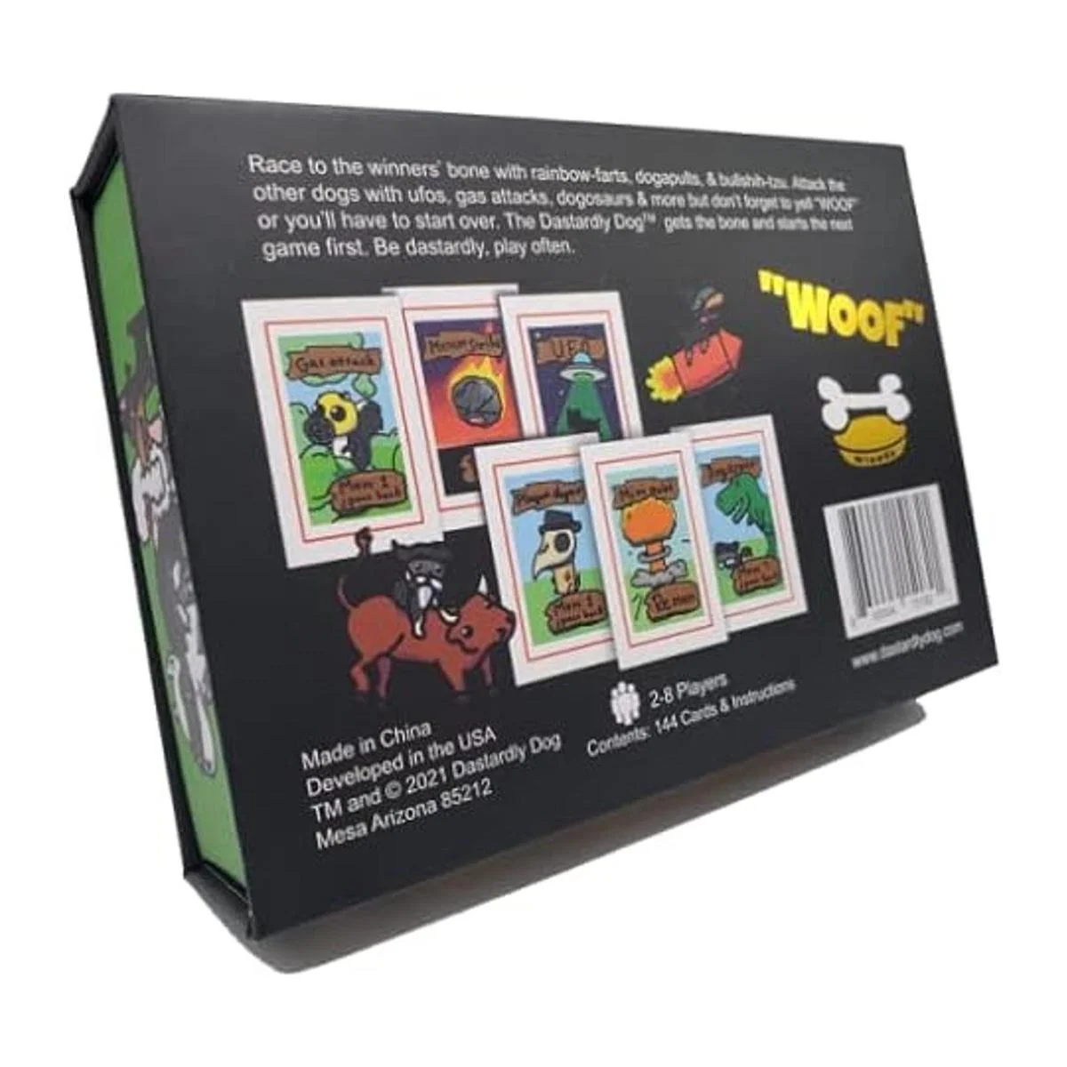 Dastardly es una carrera al hueso del ganador, el primer perro en llegar comienza primero el próximo juego. Este juego de cartas está lleno de movimientos atrevidos y acción rápida que te hará ladrar por más. En esta tarjeta de juego de fiesta puedes utilizar impresionantes ataques como zombies, OVNI, golpes de meteoritos, gatos enojados y aún más.