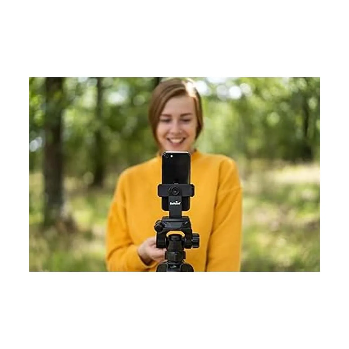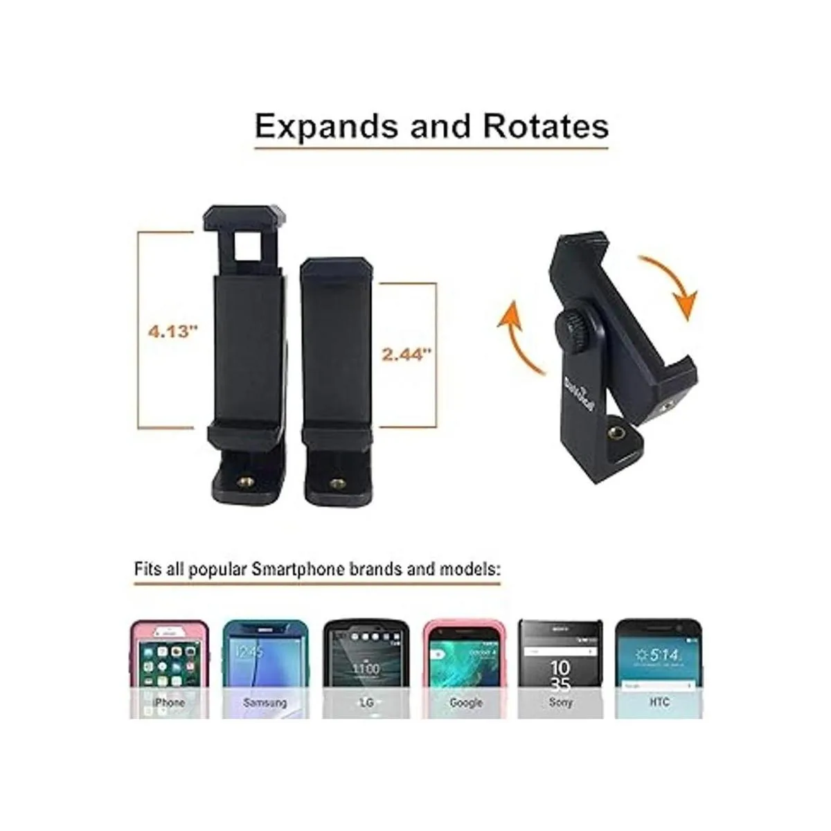El adaptador de trípode para teléfono sostiene de forma segura teléfonos celulares y dispositivos de 2.44 a 4.06 pulgadas de ancho, sin quitar fundas protectoras; también funciona como un adaptador de trípode para iPhone y soporte de teléfono para trípode