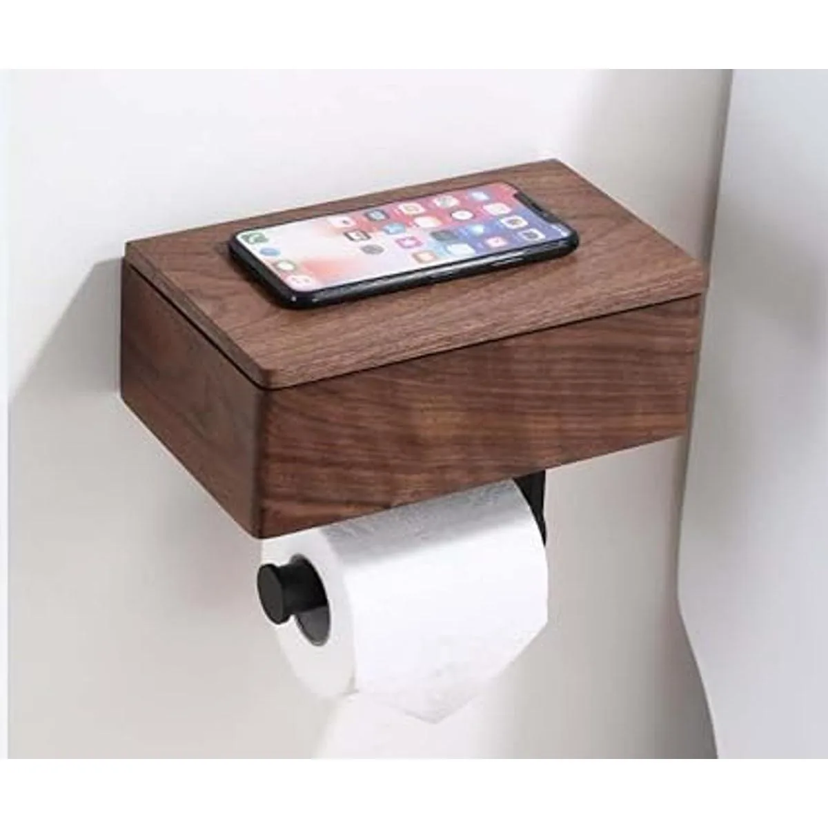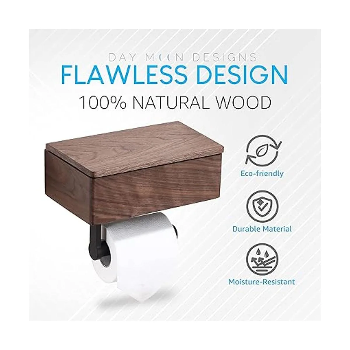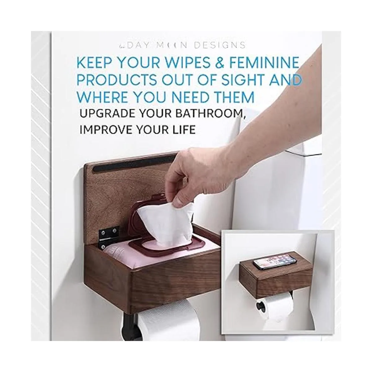 Day Moon Designs Soporte de papel higiénico de madera, soporte de papel higiénico de madera para montaje en pared con estante como dispensador de toallitas desechables, almacenamiento de baño, caja de soporte para teléfono y almacenamiento de baño, madera de nogal negro