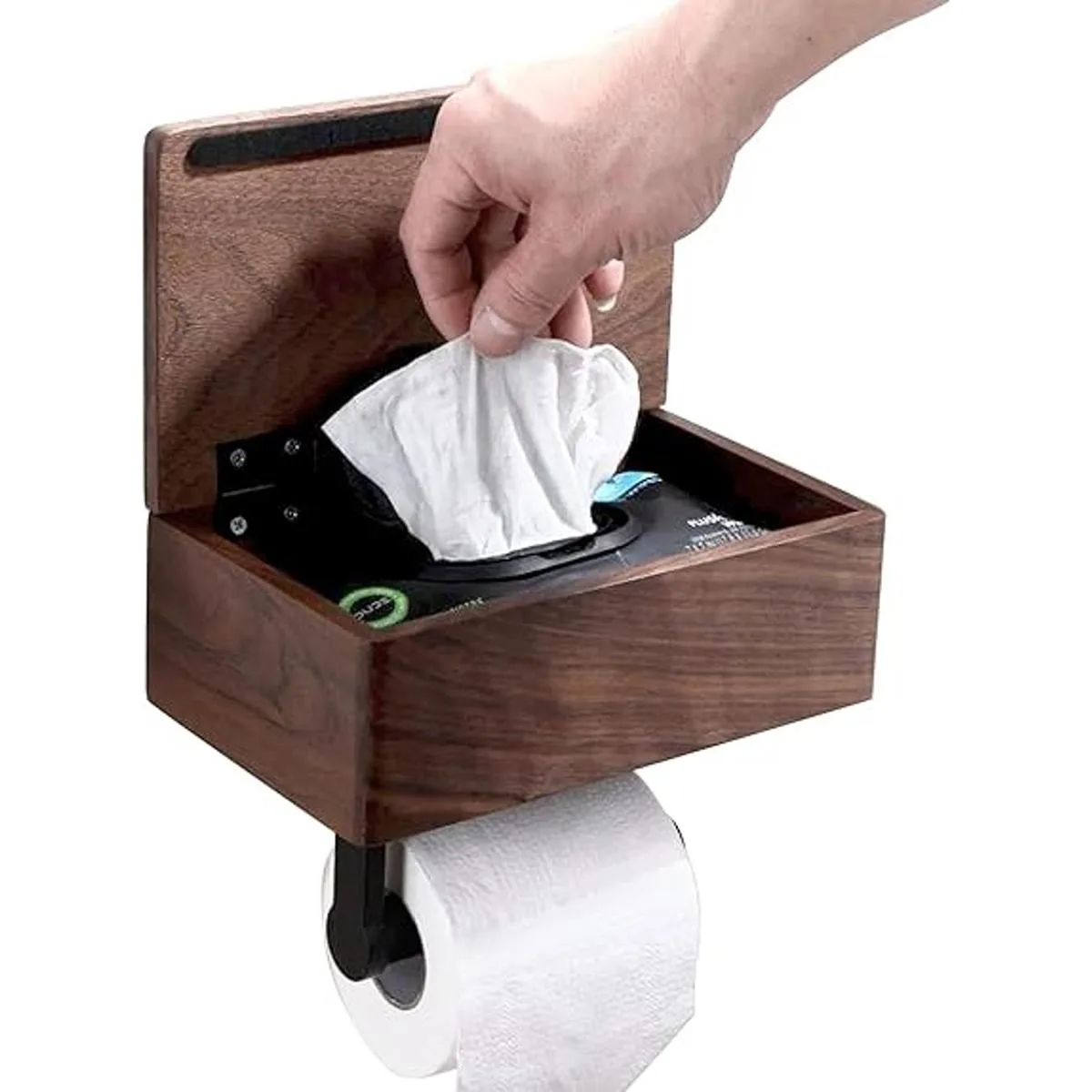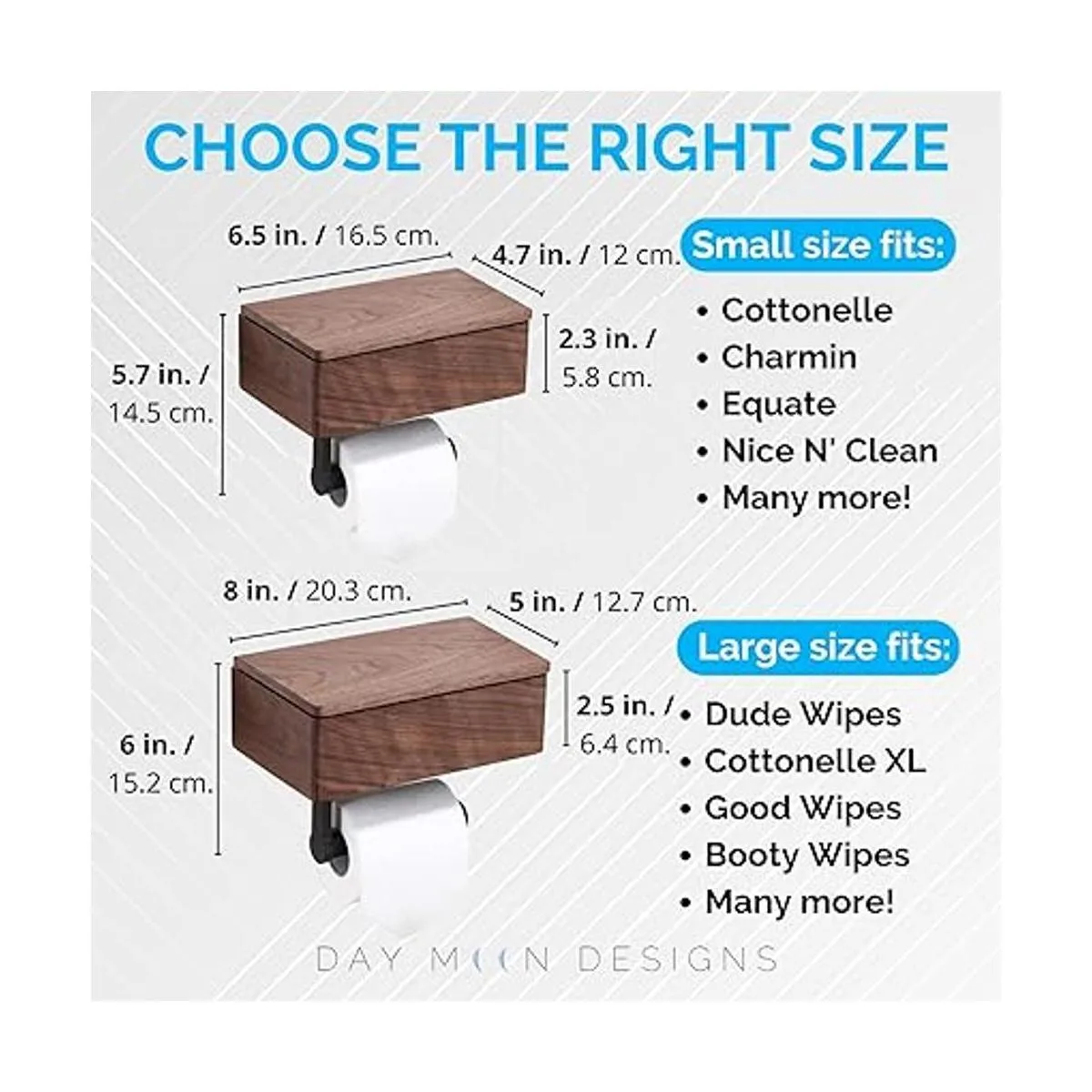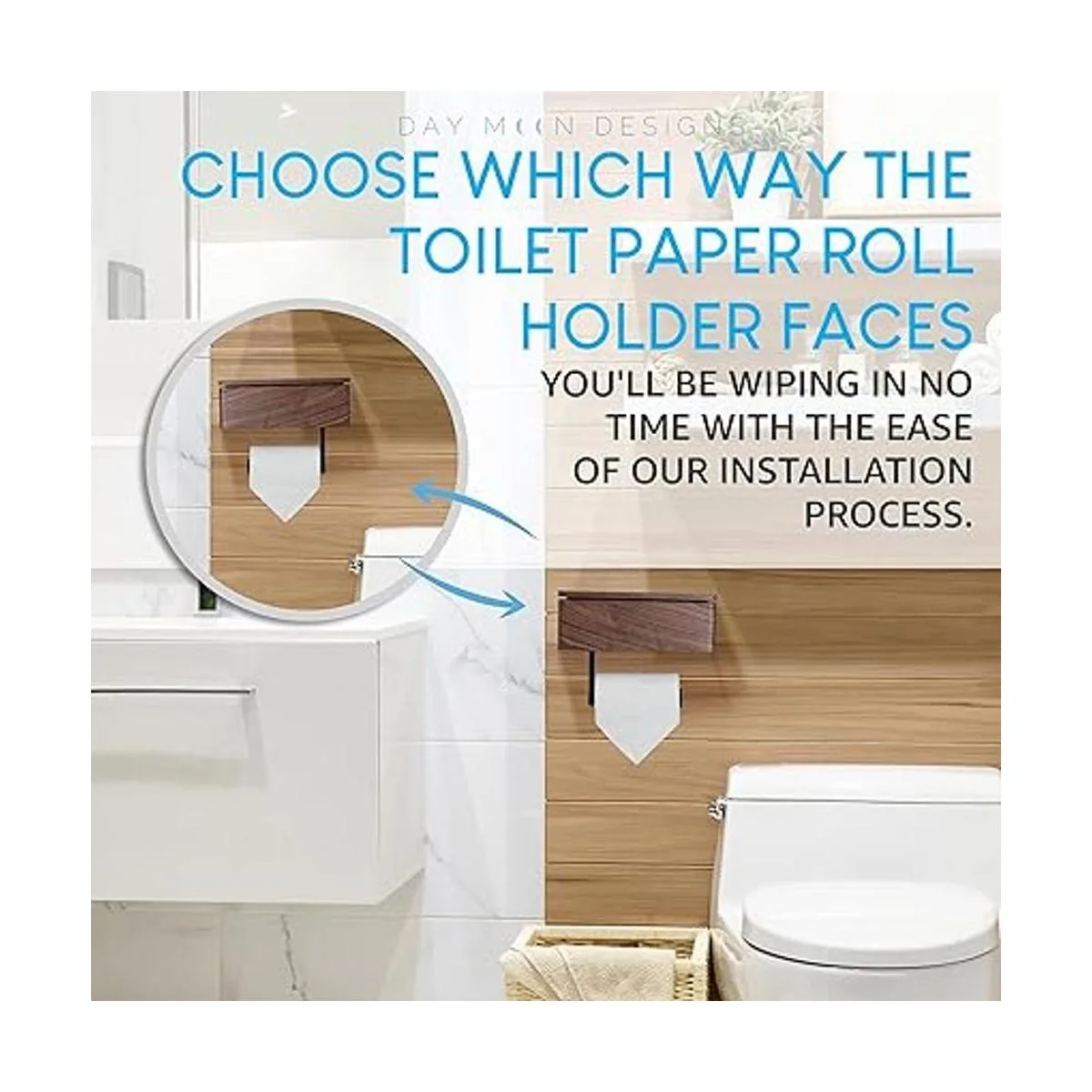 Day Moon Designs Soporte de papel higiénico de madera, soporte de papel higiénico de madera para montaje en pared con estante como dispensador de toallitas desechables, almacenamiento de baño, caja de soporte para teléfono y almacenamiento de baño, madera de nogal negro