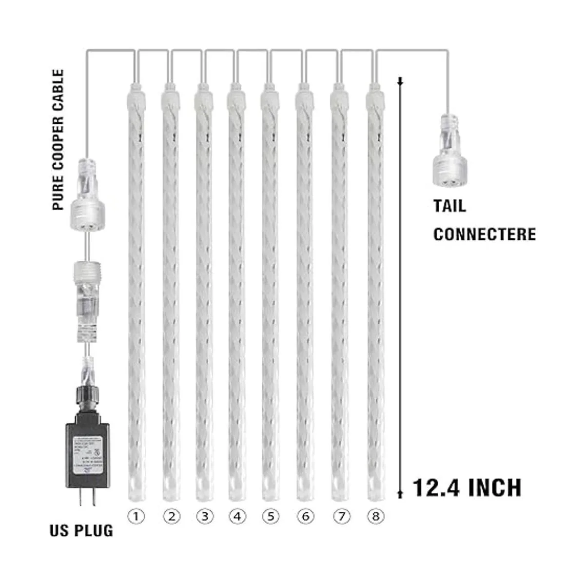 Dimensiones: cada luz de lluvia de meteoritos brillante tiene 8 tubos, cada tubo mide 11.8 in de largo, cada tubo es independiente de otros tubos. El cable de cadena entre el tubo es de 14 pulgadas, cada luz tiene un cable de plomo de 16.4 pies, te permite conectar la alimentación cómodamente.