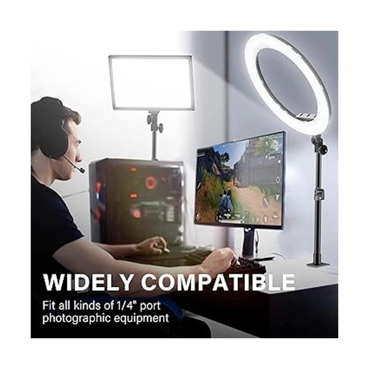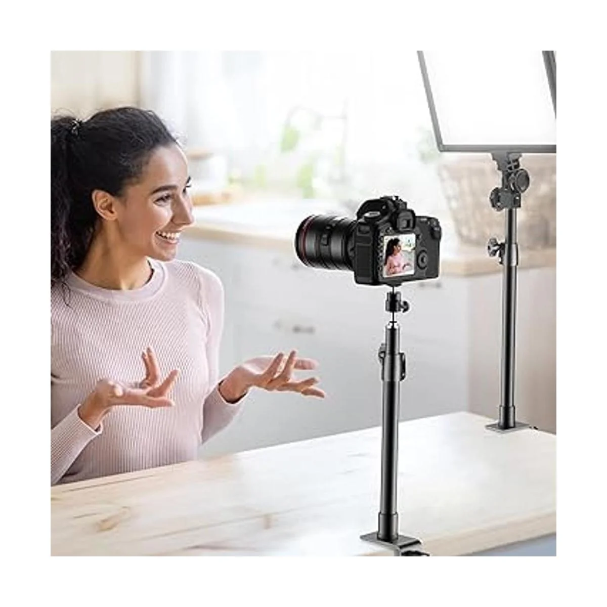 Soporte ajustable: 2 paquetes de soporte de luz de escritorio. La altura de cada soporte se puede ajustar de 12.9 pulgadas a 22 pulgadas a través de la perilla fija. Puedes cambiar fácilmente la altura de tu anillo de luz o luz de video para obtener el gran lugar de trabajo