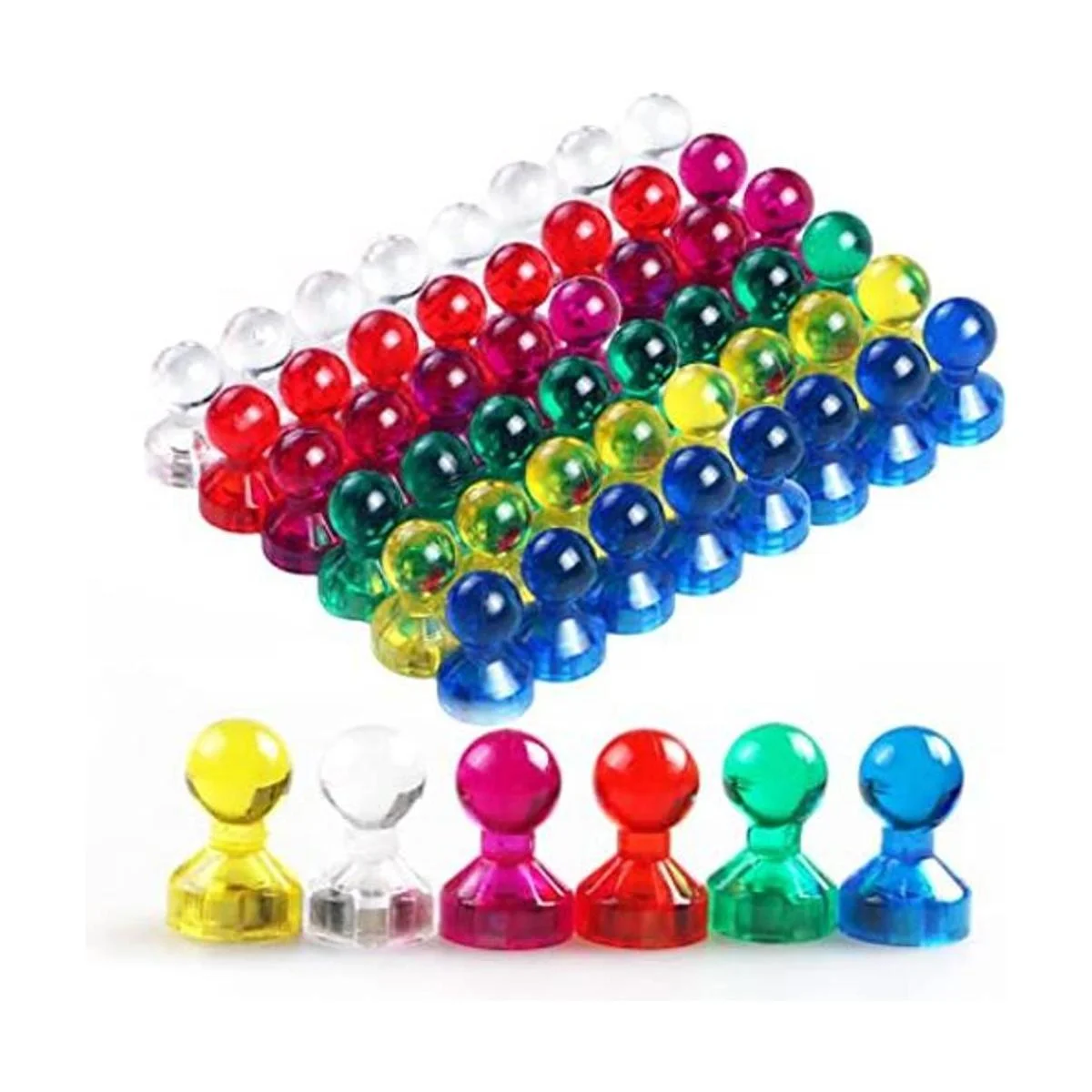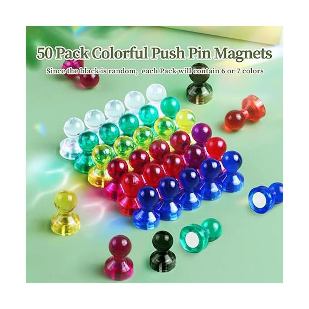 Rico en color: solo para tu vida colorida Paquete de 50 imanes decorativos con 8 colores 6 para cada color 2 colores aleatorios, incluyendo azul, naranja, amarillo, verde, transparente, morado, negro y rosa intenso. Los colores brillantes son atractivos para los niños, lo que hará que tu oficina, aula, cocina y hogar se vean brillantes y alegres Perfecto para código de color, organizar y decoración navideña.