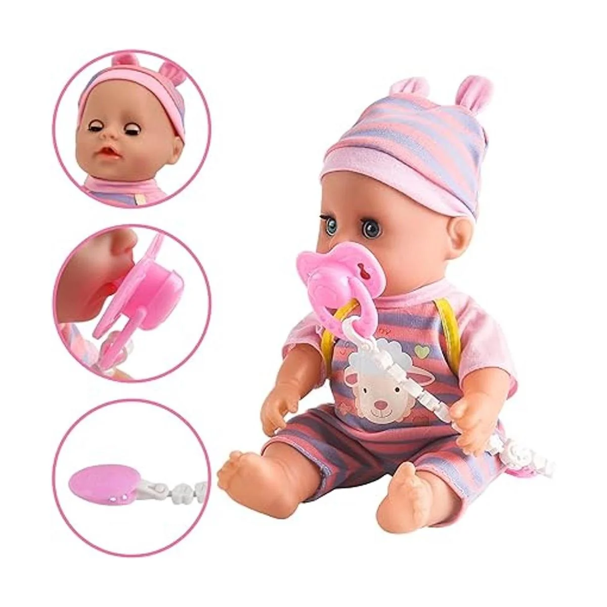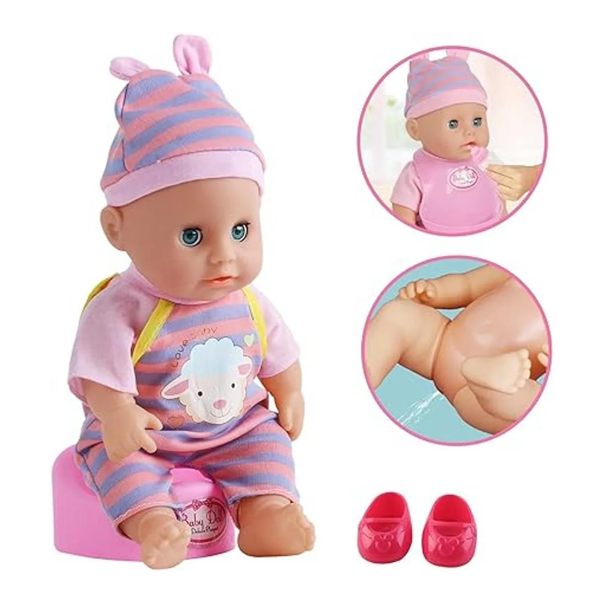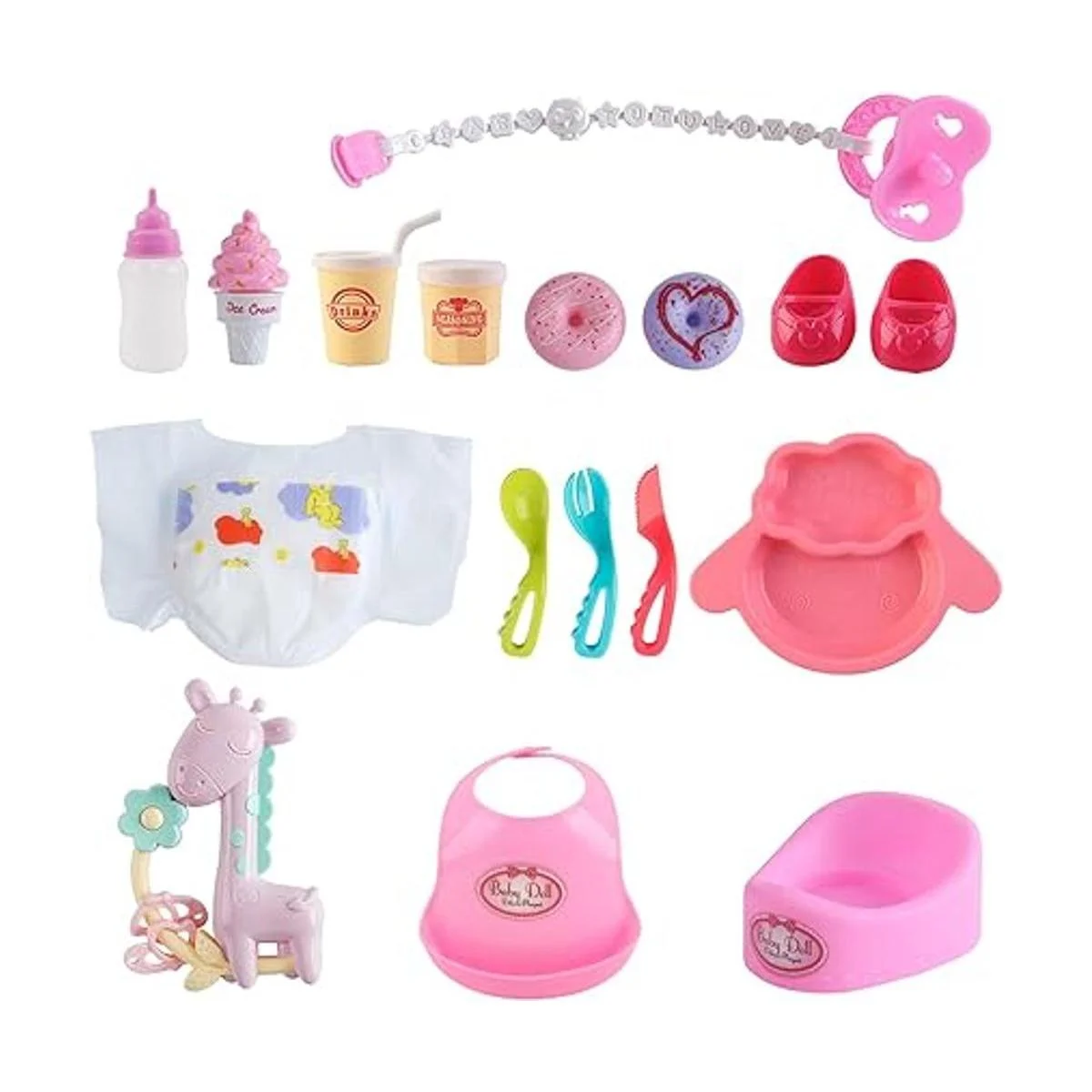 Juego de muñecas de bebé DeAO: el juego en miniatura de My First Baby Doll es perfecto para un pequeño que ama cuidar de los demás. El juego viene con 1 muñeca de bebé de 12 pulgadas, 1 cuna de bebé en miniatura, 1 silla alta en miniatura, 1 almohada en miniatura de juguete, 1 accesorio de sonajero para bebé, 1 biberón, 1 chupete de juguete, 2 tazas para beber, 1 helado, 2 donas, 1 zapato de bebé, 1 móvil de juguete para bebé, 1 orinal de juguete, 1 juguete 1 apertura. babero de juguete y 4 piezas de cubiertos de juguete.