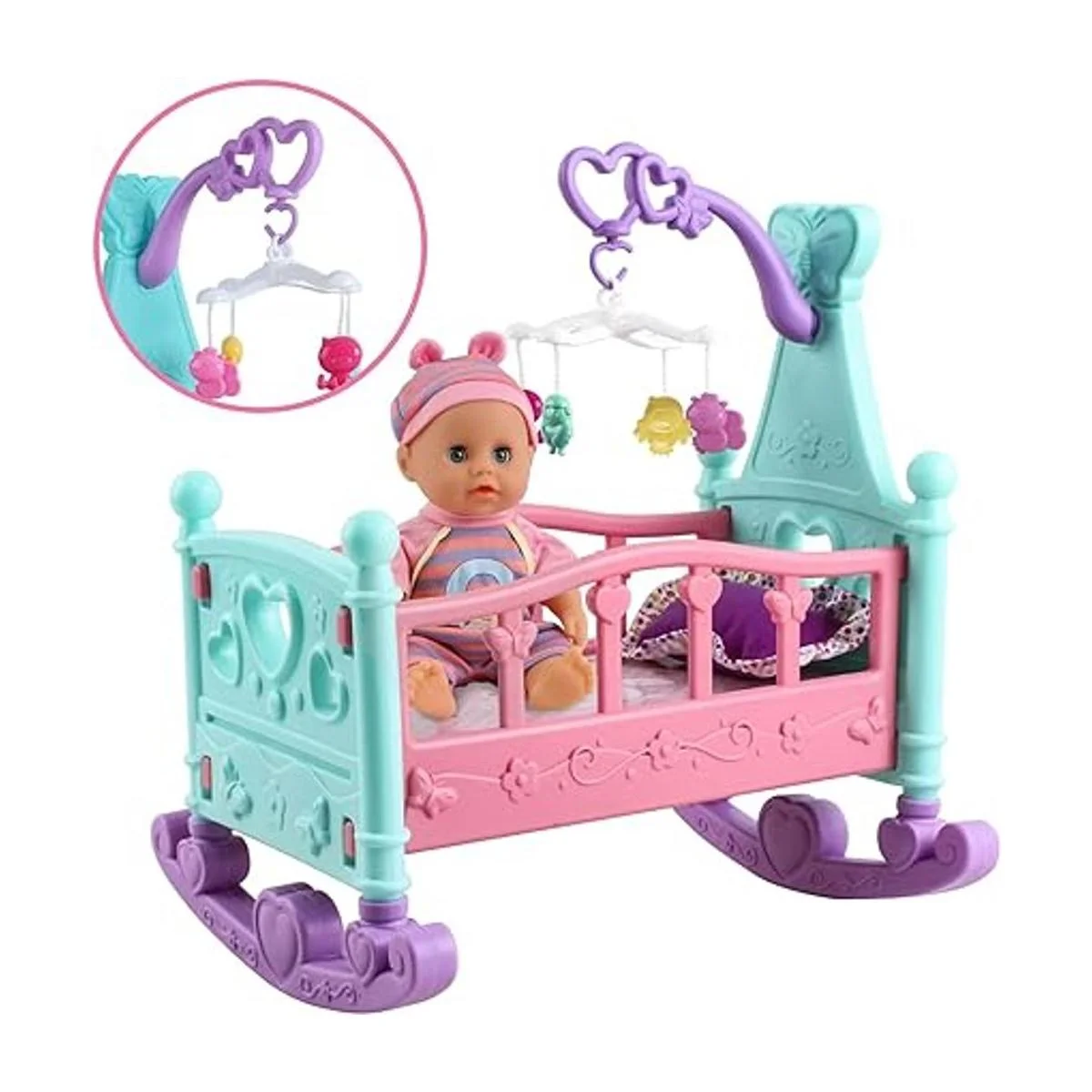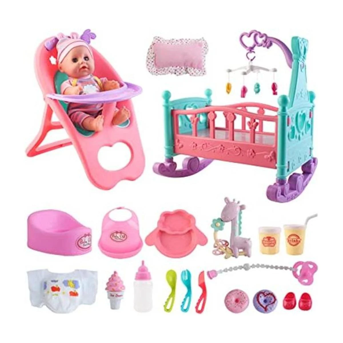 deAO Juego de muñecas de bebé de 12 pulgadas con cuna, móvil, accesorios de alimentación para silla alta, muñecas interactivas para niñas y niños, muñecas realistas de simulación, 21 piezas