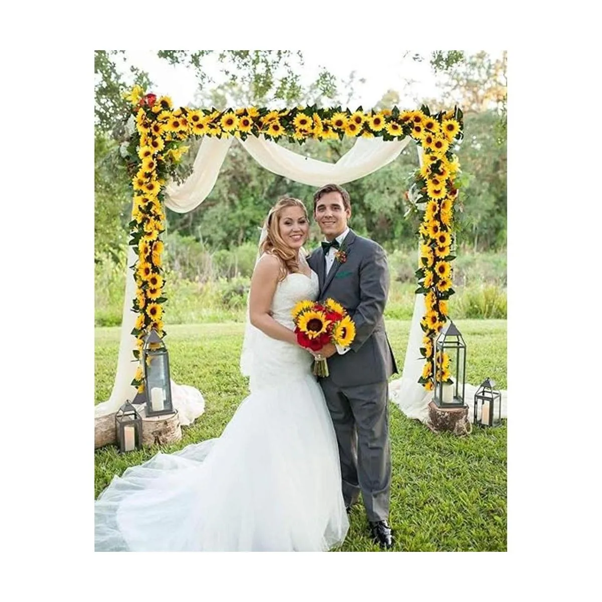 Tamaño: cada guirnalda de 7.4 pies de largo, flores de 4 pulgadas de diámetro, cada guirnalda tiene capacidad para 72 hojas, 8 flores. La manera perfecta de acentuar tu boda, hay dos paquetes de guirnaldas de girasol artificiales por paquete