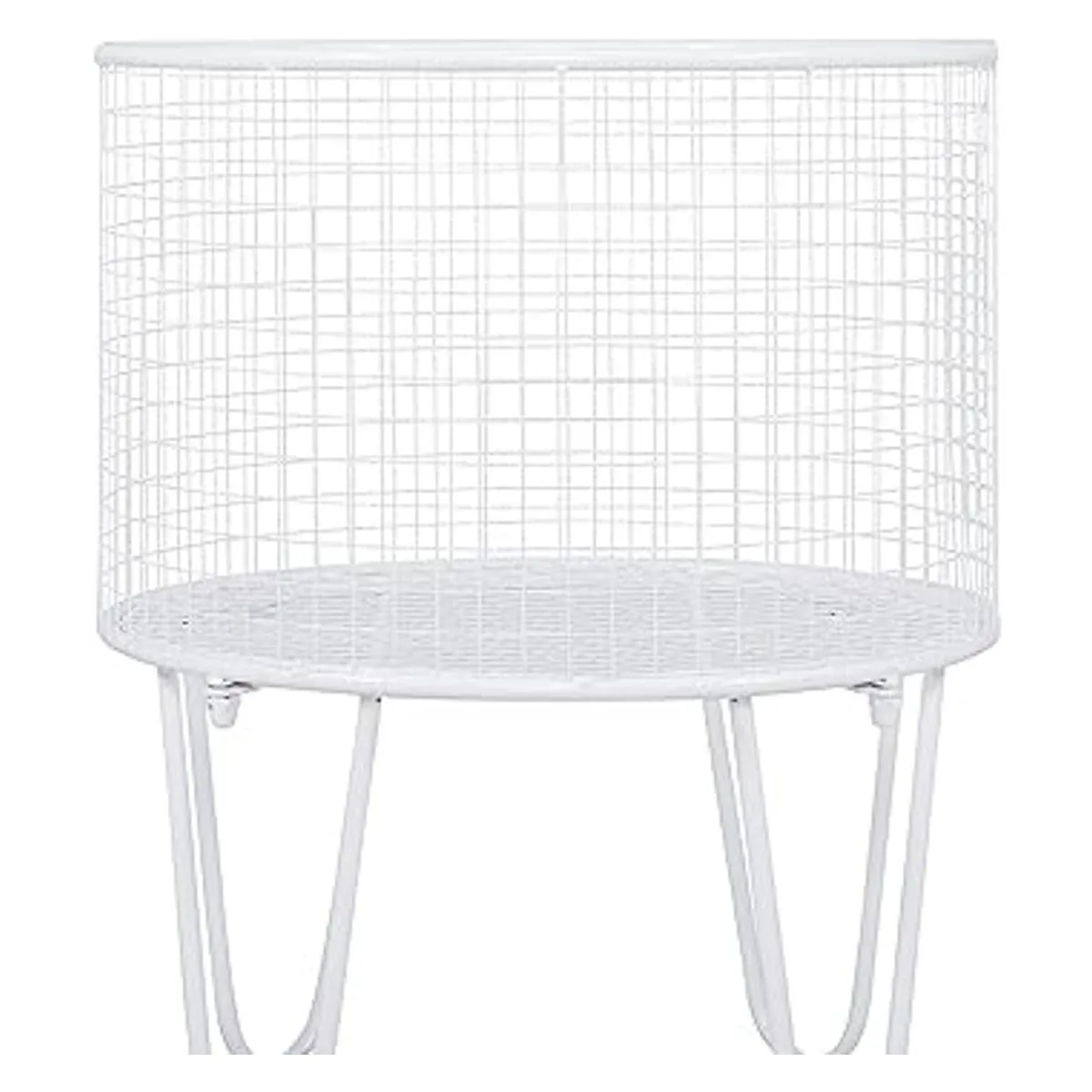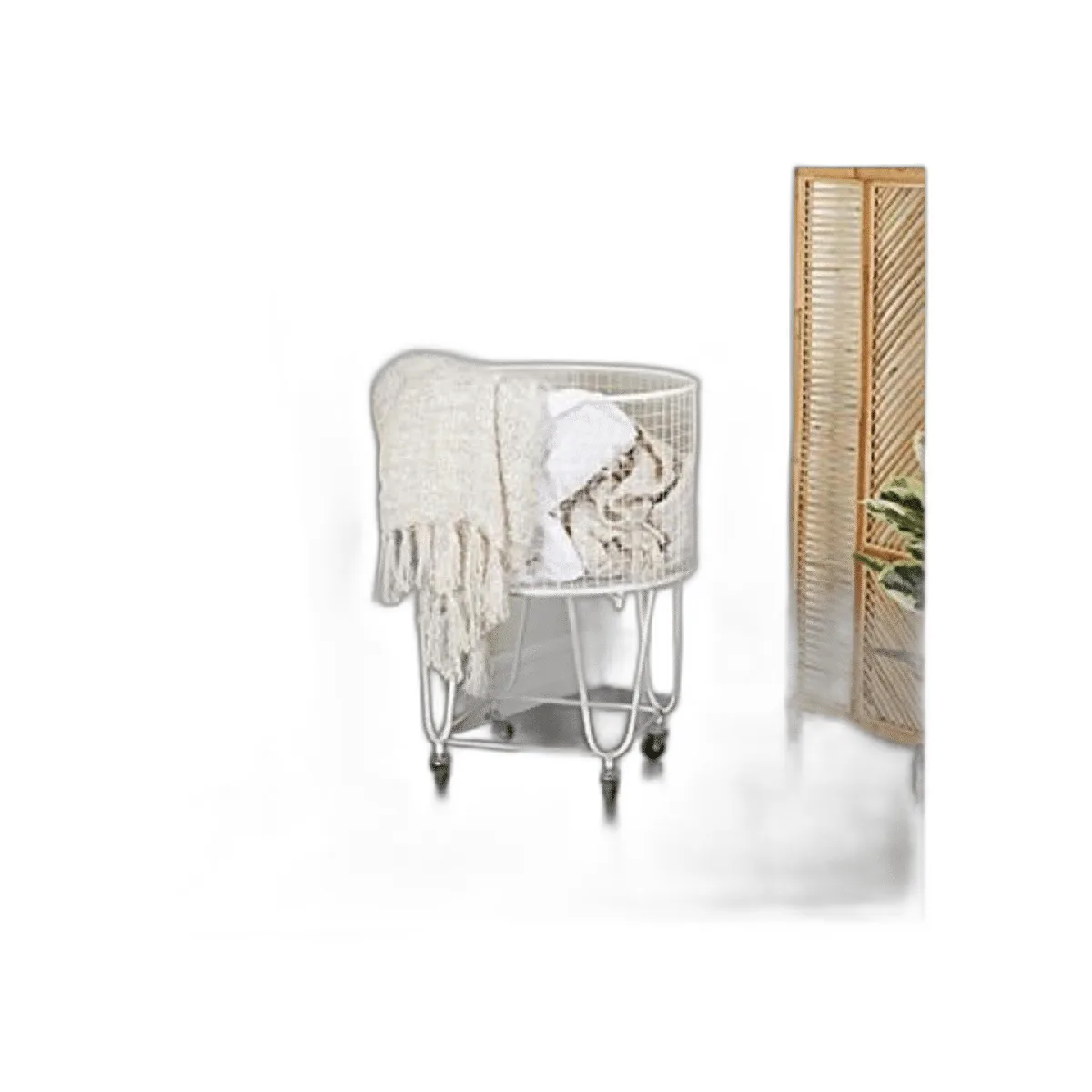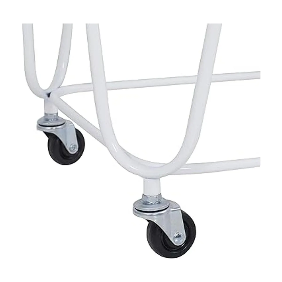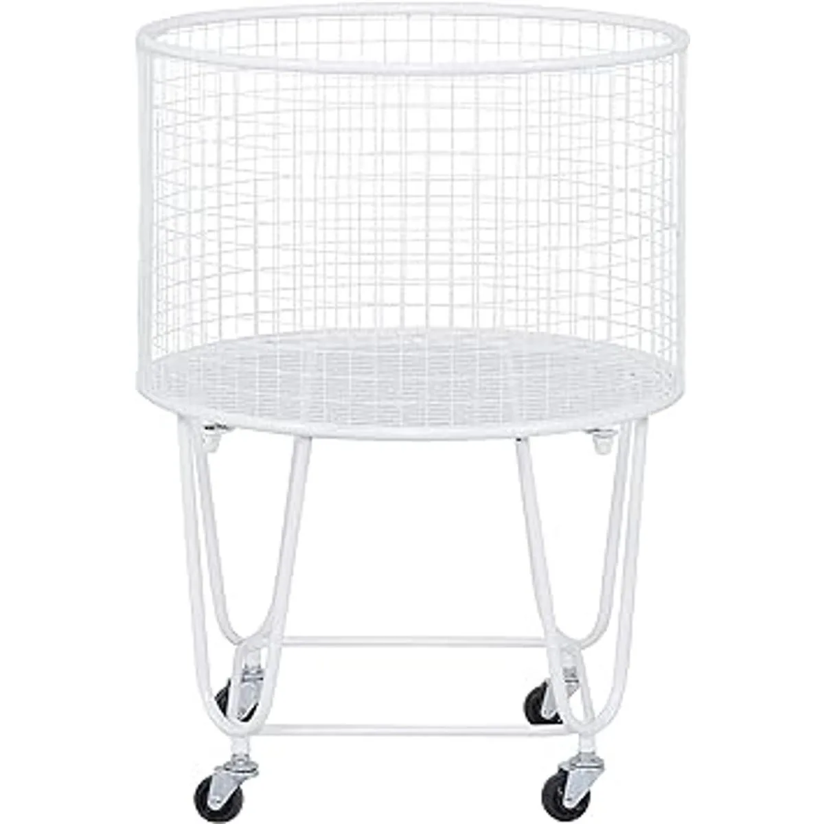 Un carrito de almacenamiento de metal blanco con un almacenamiento de estilo rejilla redonda, base de diseño abierto y ruedas giratorias