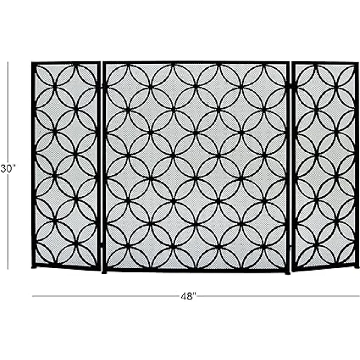Pantalla plegable para chimenea: de 30 pulgadas de alto x 48 pulgadas de largo, esta pantalla de metal cuenta con tres marcos de barra con bisagras con patrones de enrejado circular superpuestos sobre una malla de alambre de estaño de tejido de diamante. No necesita montaje. Todo lo que tienes que hacer es colocar esta hermosa pieza en el hogar.