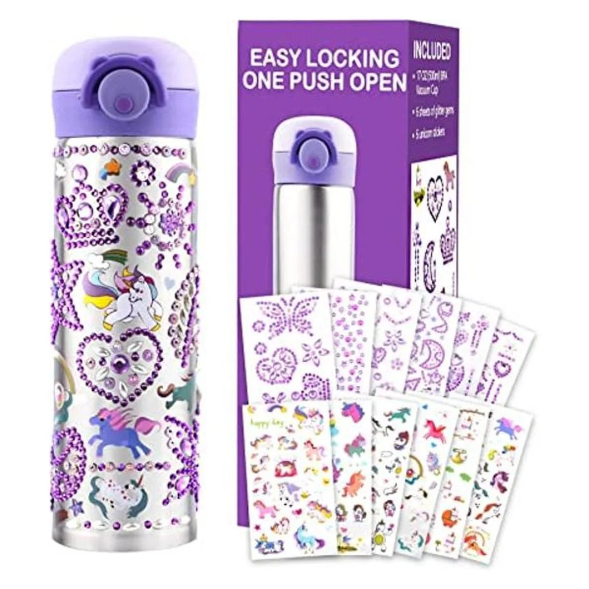 Decora tu propia botella de agua, regalos de Navidad para niñas de 6 a 12 años con 12 hojas de calcomanías de gemas con purpurina de unicornio y diamantes de imitación, manualidades y artes, taza aislada de acero inoxidable sin BPA de 17 onzas