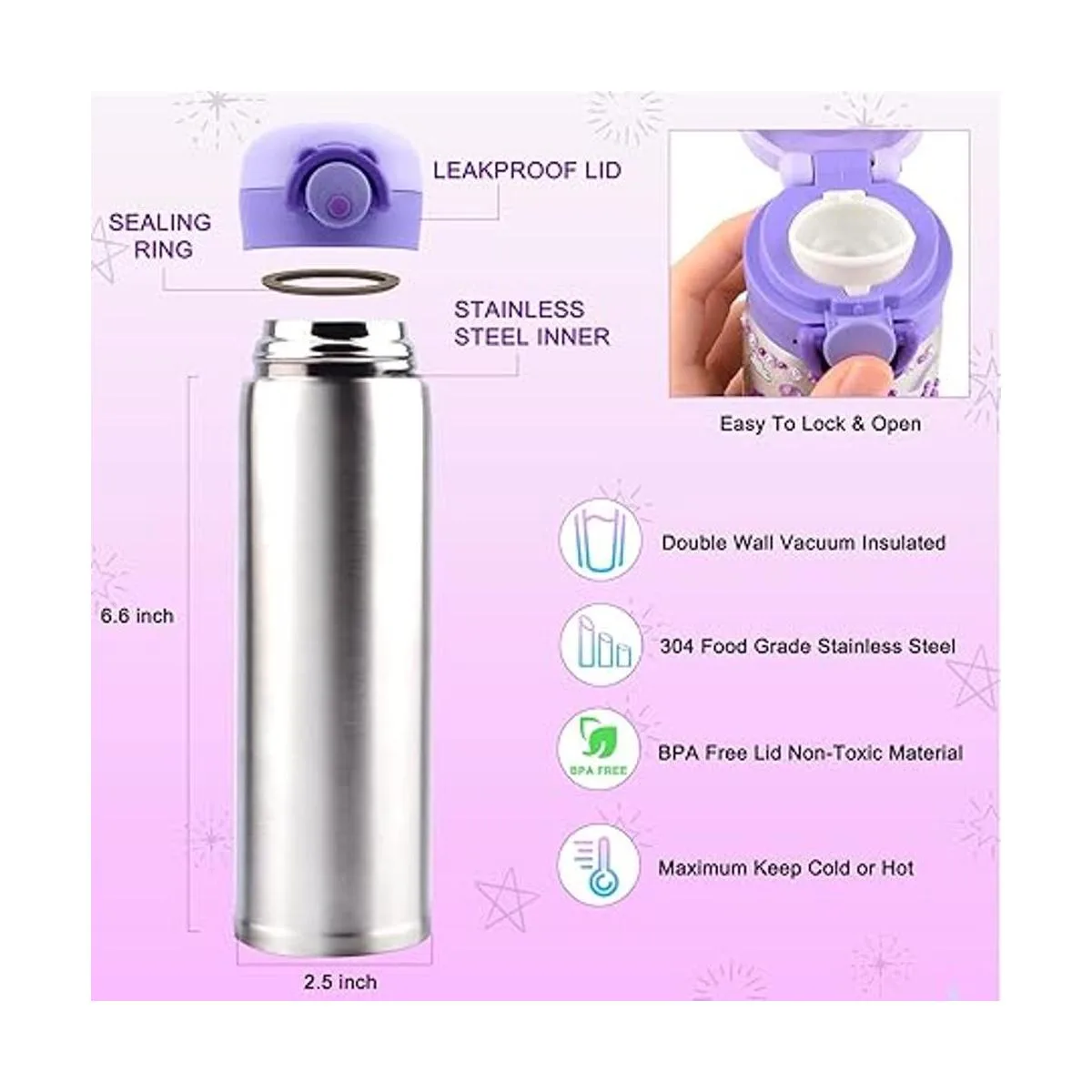 Función a prueba de fugas y diseño mejorado : las botellas de agua para niñas están adoptadas para un diseño mejorado que tiene un anillo de goma metido en la tapa para evitar que el agua se filtre. La tapa también está cuidadosamente diseñada con un botón morado, que se abrirá cuando presiones la boca de la botella suavemente. Lo más importante es que el tamaño de la boca de la botella está en línea con el tamaño de la boca de una niña de 6, 7, 8, 9, 10, 11, 12 años. Nota: se recomienda lavar la botella a mano