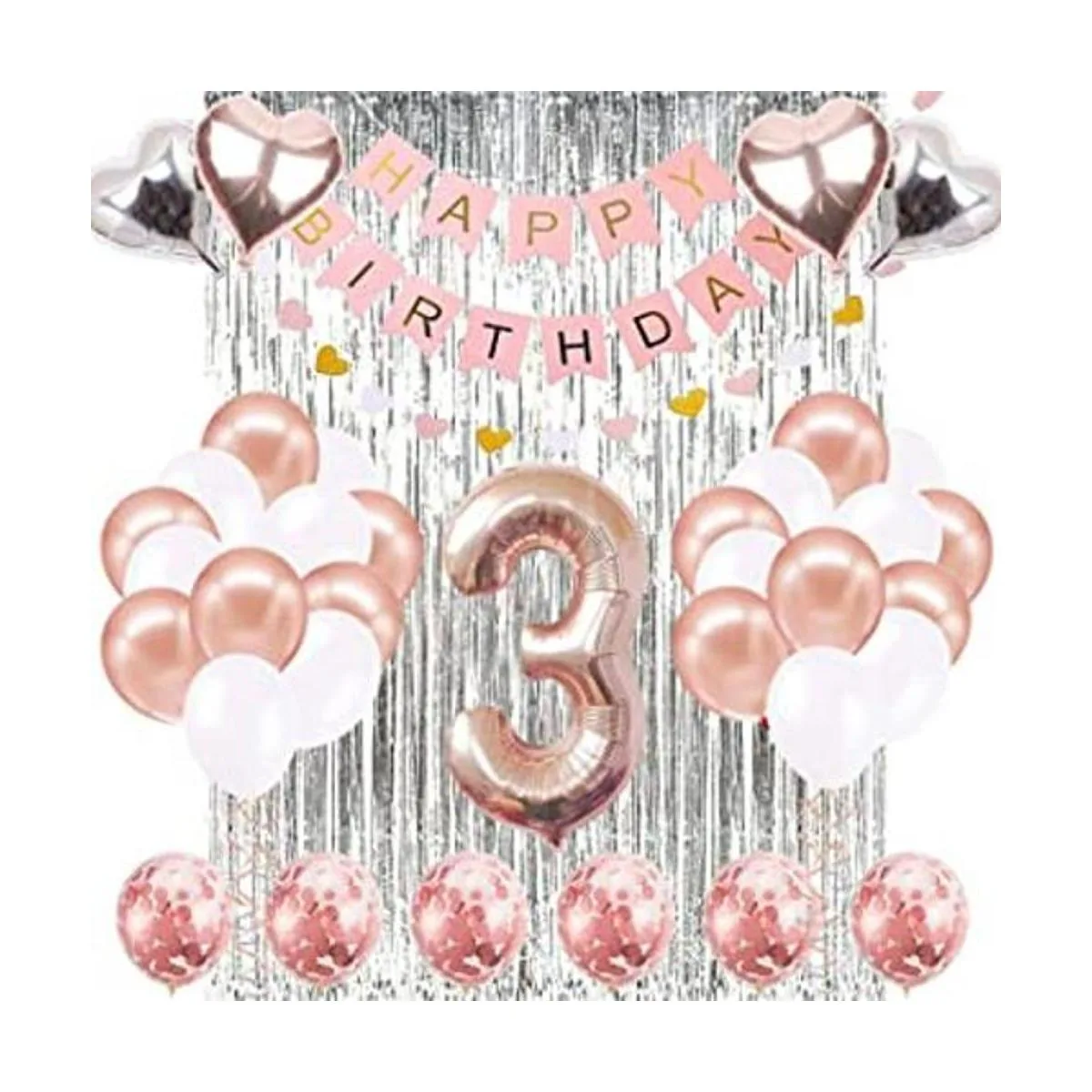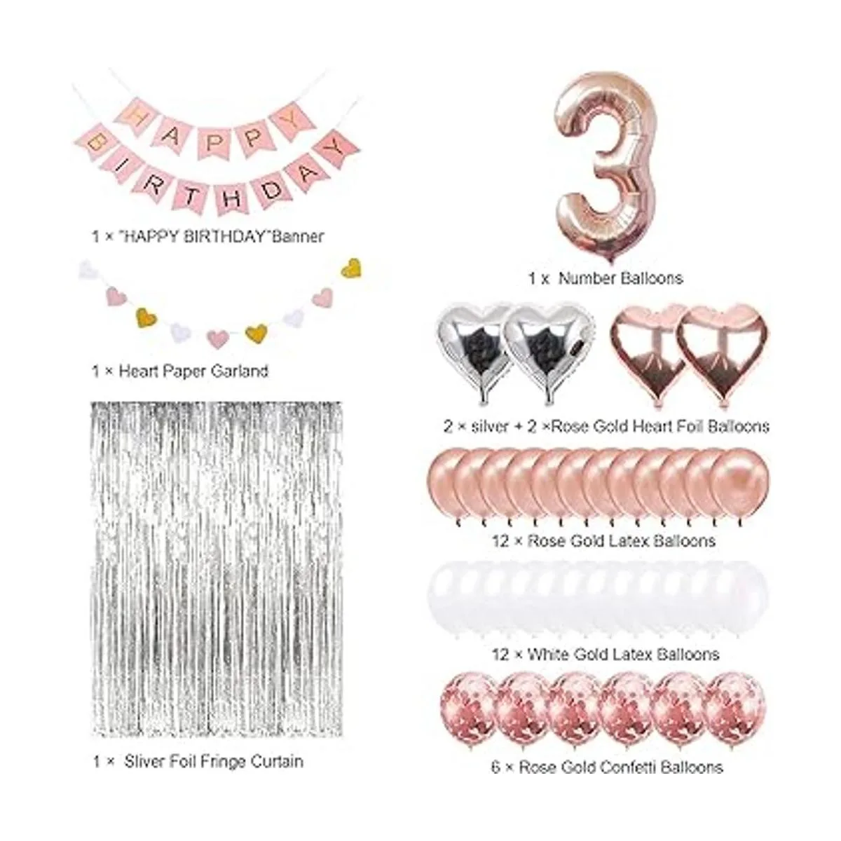 Decoración de 3er cumpleaños para niña, decoración de tres cumpleaños con pancarta de feliz cumpleaños, globos número 3 para suministros de fiesta de oro rosa, decoración de 3er cumpleaños