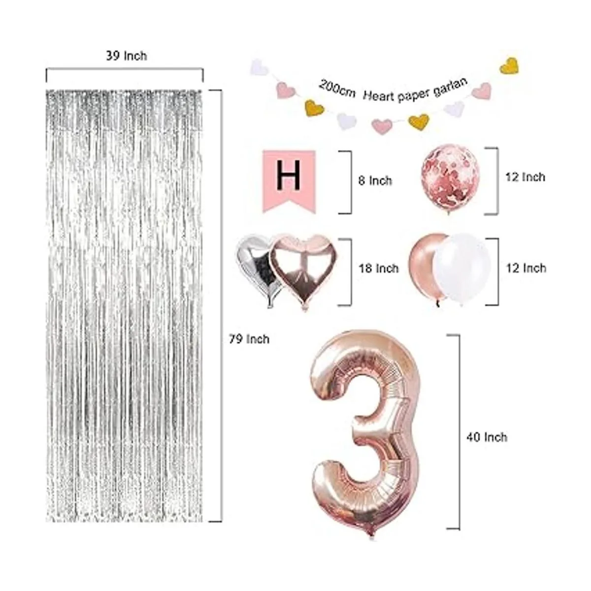 Paquete de gran valor: el juego de decoración para el tercer cumpleaños incluye pancarta de feliz cumpleaños 1 juego, globos de látex 24 unidades, globos de confeti 6 unidades, globos de papel de aluminio 4 unidades, guirnalda de corazón 1 juego, 1 cortina de flecos de aluminio, globo grande número 3. Fácil de usar e incluye todo lo que necesitas para celebrar tu fiesta de cumpleaños.