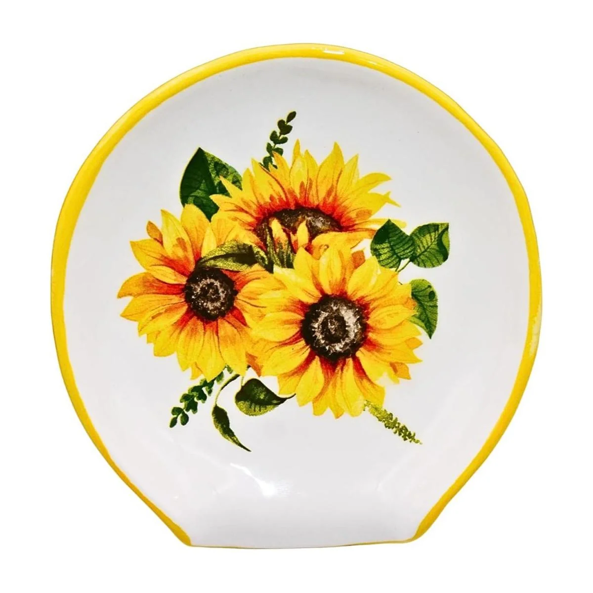 El girasol ilumina tu cocina Un artículo imprescindible para la decoración, el adorable soporte para cucharas de girasol iluminará la encimera o mesa de cualquier cocina. Disparando de arcilla natural y pintado con un acabado brillante, este vibrante soporte para cucharas añadirá color y diversión a tu hogar durante años.