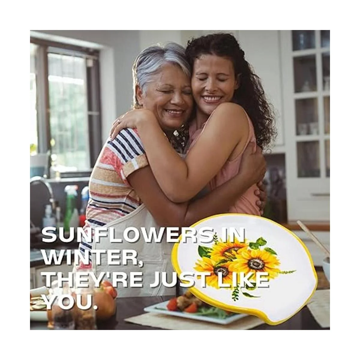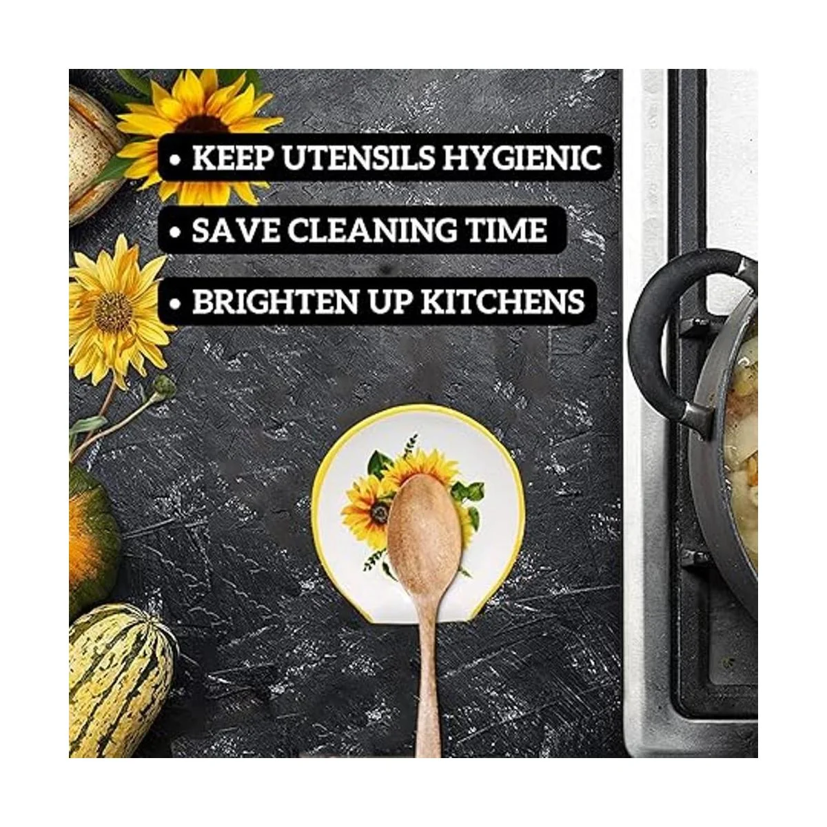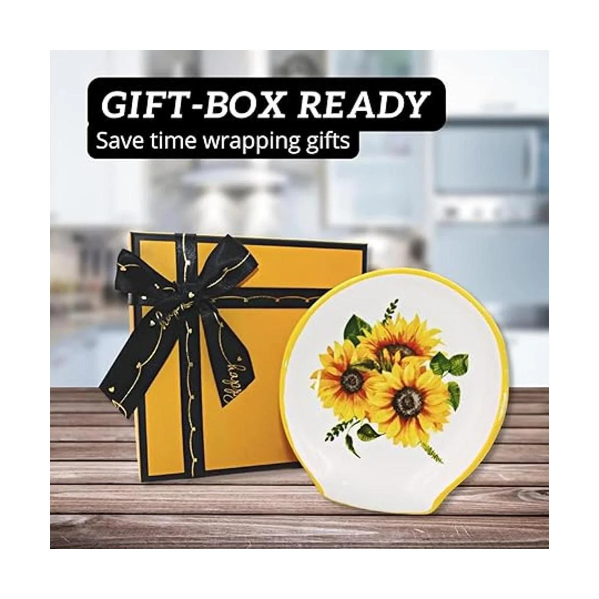 Regalos únicos con cajas de regalo preenvueltas Este soporte para cucharas de girasoles es perfecto para cualquier hogar con pasión por cocinar. Hemos envuelto tu regalo con antelación con una cinta negra, simplemente compra y regala o envía directamente a su lugar.