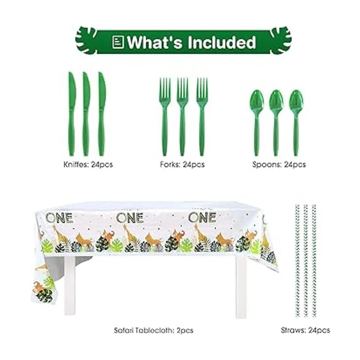 Decoración de cumpleaños NAIWOXI Wild One Decoración de cumpleaños de safari, incluyendo platos de safari, tazas, servilletas, mantel, pajitas, cubiertos, suministros de fiesta para 24 invitados