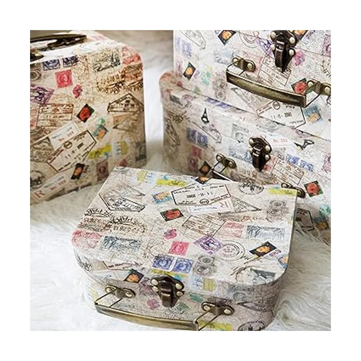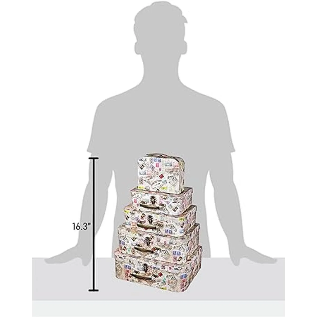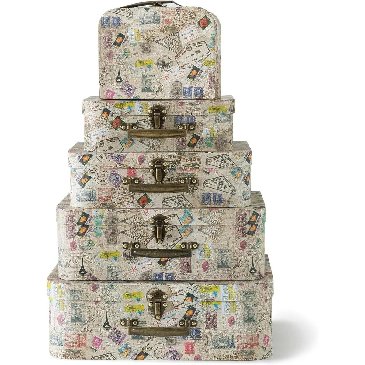 Decoración de fiesta temática de viaje, cajas de cartón vintage con tapas con bisagras, organizador de juguetes pequeños, caja de almacenamiento de fotos de cartón decorado, caja de almacenamiento de accesorios de boda, juego de 5 maletas de decoración de recuerdos de fiesta