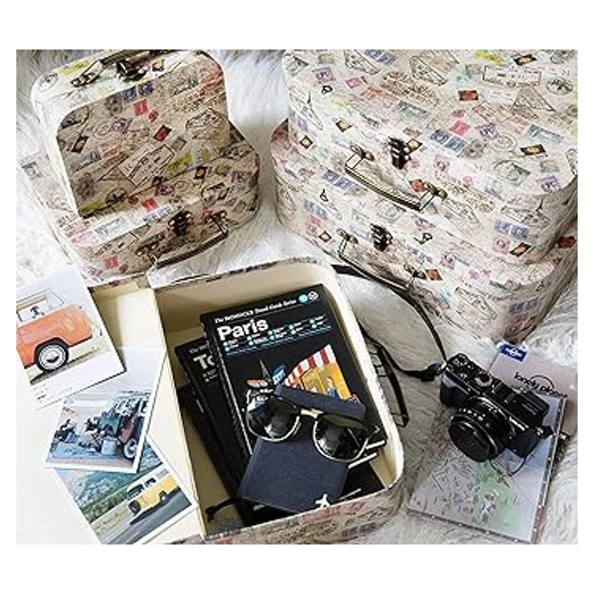 Cajas de almacenamiento vintage blancas con temática de viaje: las cajas de maleta de diseño elegante cuentan con gráficos inspirados en viajes sobre un fondo crema. Con un aspecto sofisticado, estos recipientes de almacenamiento de juguetes añaden un estilo aventurero y mantienen los tesoros de los niños en orden.