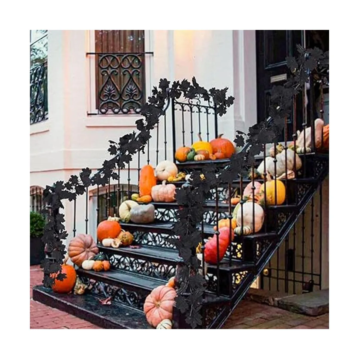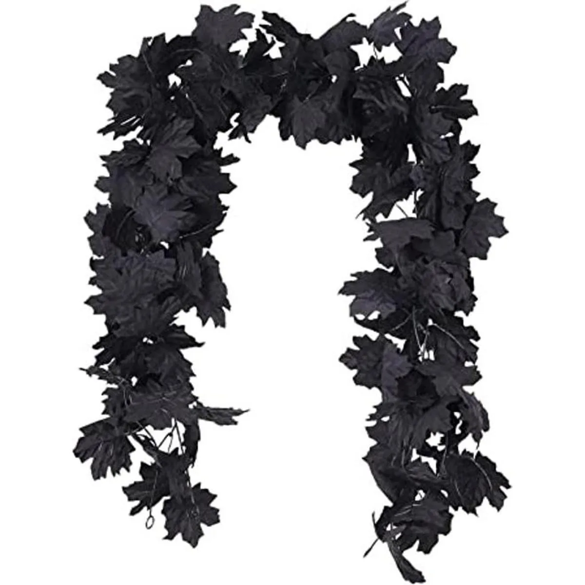Decoración de otoño, guirnalda negra, decoración negra, guirnalda de Halloween, hojas de arce para colgar en la pared, vid artificial de hojas de arce negro, decoración de Halloween, decoración de otoño para el hogar, paquete de 2