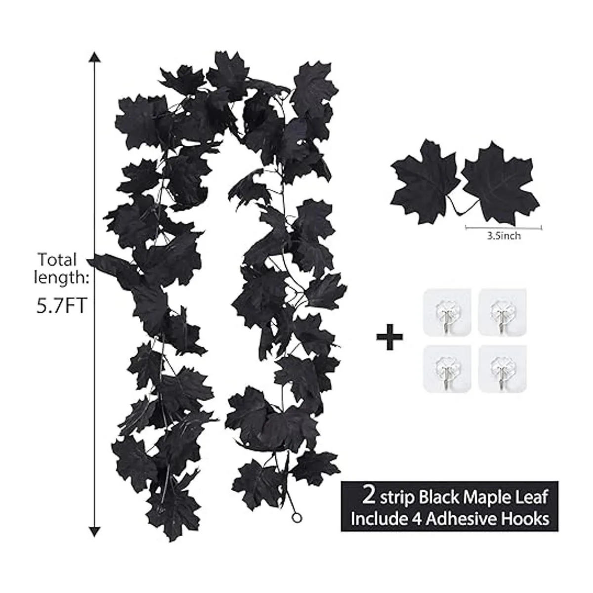 Material de la guirnalda negra: las hojas de arce están hechas de plástico de calidad y hojas de tela de seda, también la textura de la hoja es clara y parece hojas reales, los tallos de la guirnalda están hechos de plástico flexible. Las hojas de arce negro pueden presentar un ambiente misterioso, opción ideal para completar la decoración de Halloween.