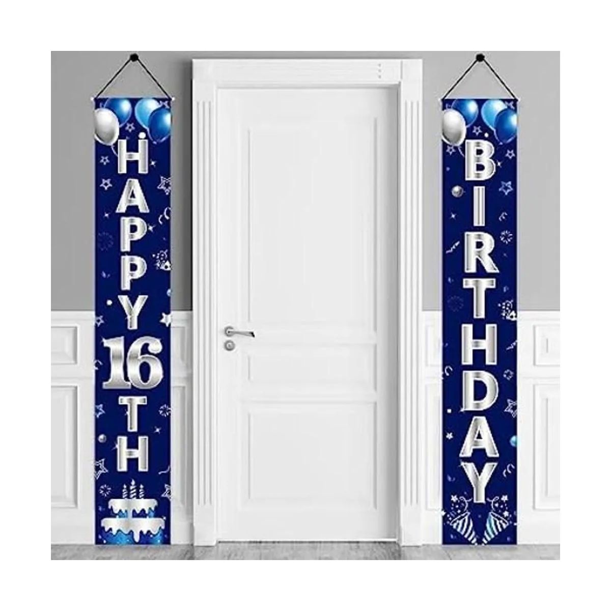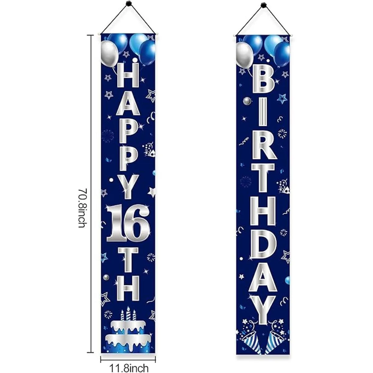 Recibirás: decoración de fiesta de 16 cumpleaños azul plateado feliz 16 cumpleaños, 70.8 x 11.8 pulgadas, incluyendo 1 pancarta de puerta Happy 16th, 1 pancarta de puerta Birthday, que es perfecta para fiestas temáticas de 16 cumpleaños azul y plateado.