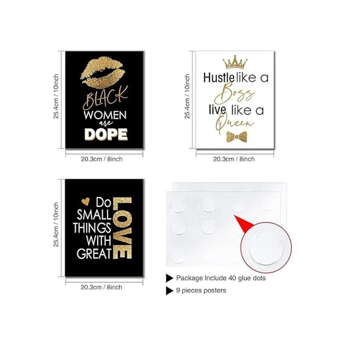 Paquete: incluye 9 hojas de impresiones artísticas inspiradoras con 2 hojas 40 piezas de puntos de pegamento; los pósteres de arte de pared están hechos de cartulina resistente con superficie laminada para un uso duradero y duradero; Nota: nuestras impresiones artísticas no contienen marcos de fotos