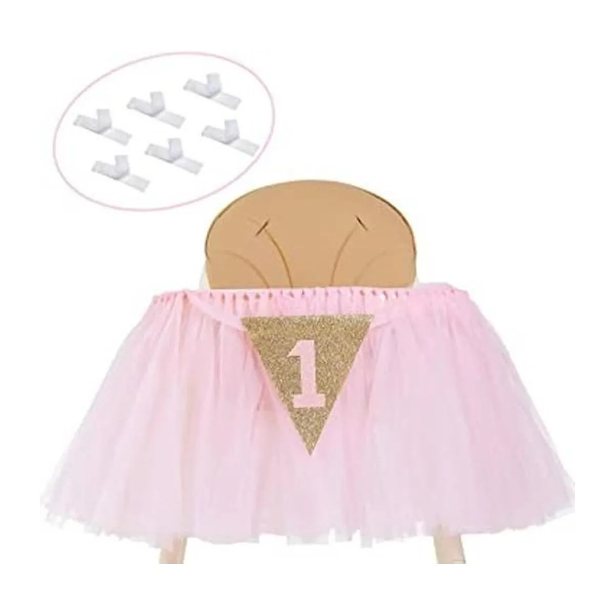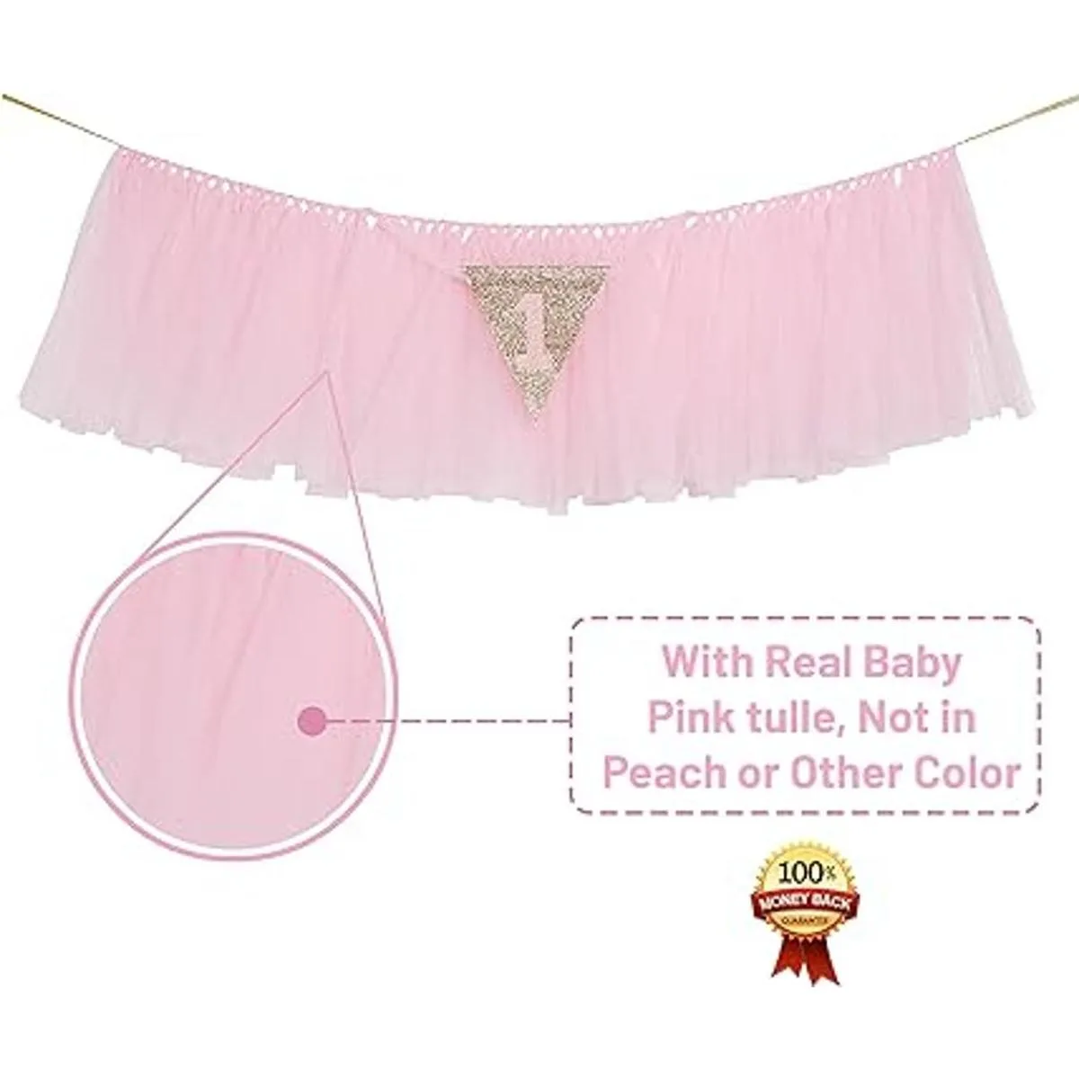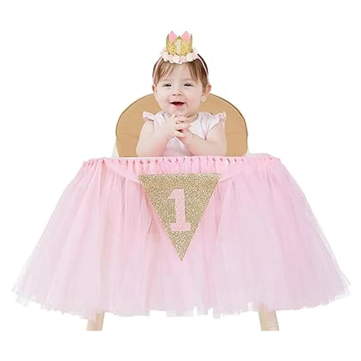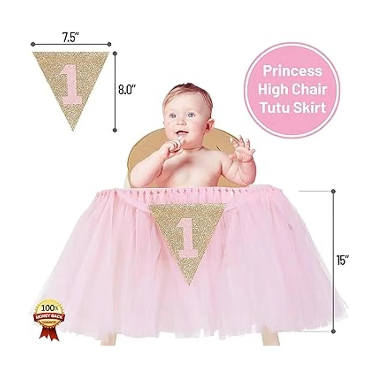 Decoración de primer cumpleaños para niña, silla alta, falda tutú, pancarta número 1, decoración de primer cumpleaños para niñas y bebés, pancarta de primer cumpleaños, centro de mesa para silla alta, tema de princesa rosa y dorado