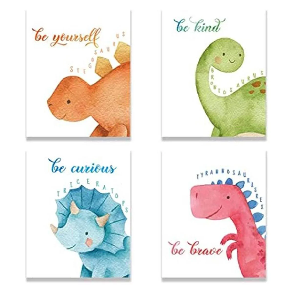 Decoración inspiradora de dinosaurios, impresiones artísticas de pared para bebé, decoración de pared de guardería, decoraciones de Be Kind Brave para niños, habitación de niños y niñas, juego de 4 8 x 10 pulgadas sin marco