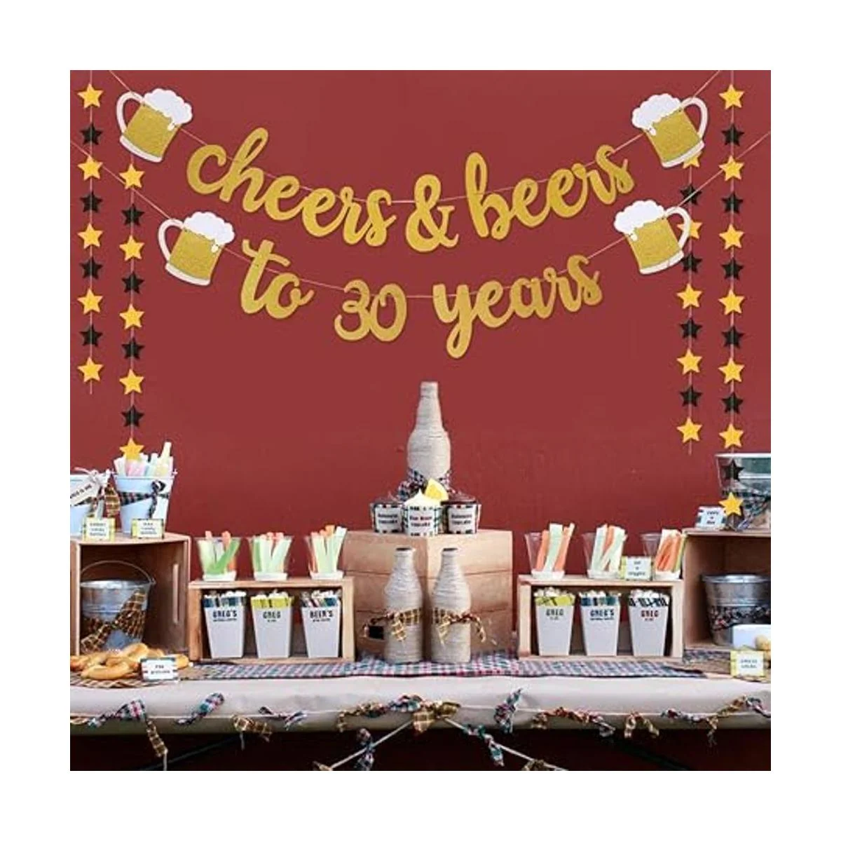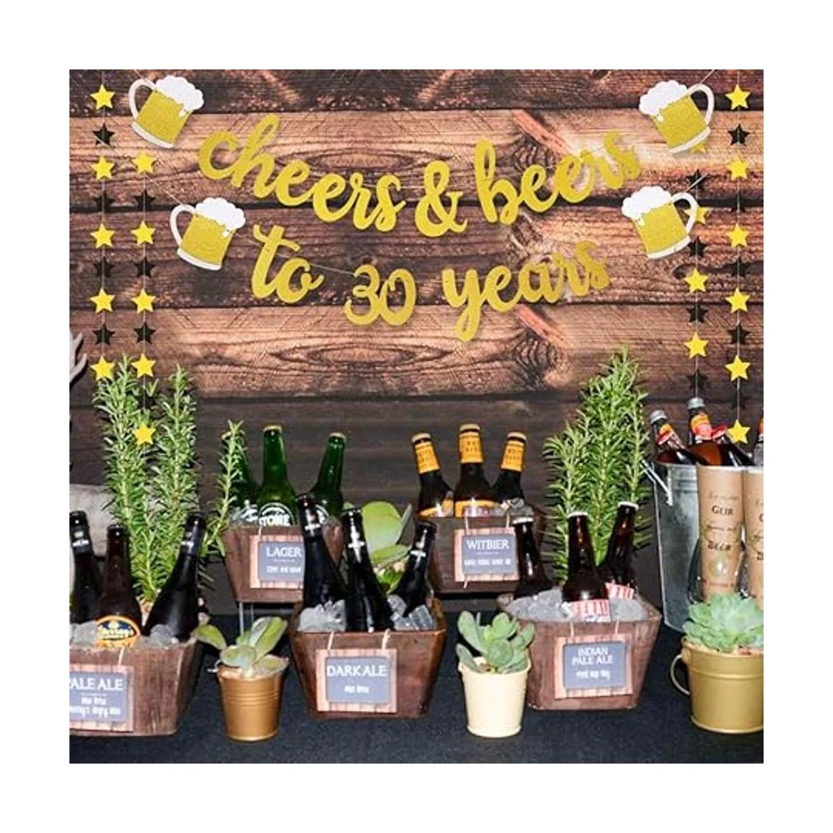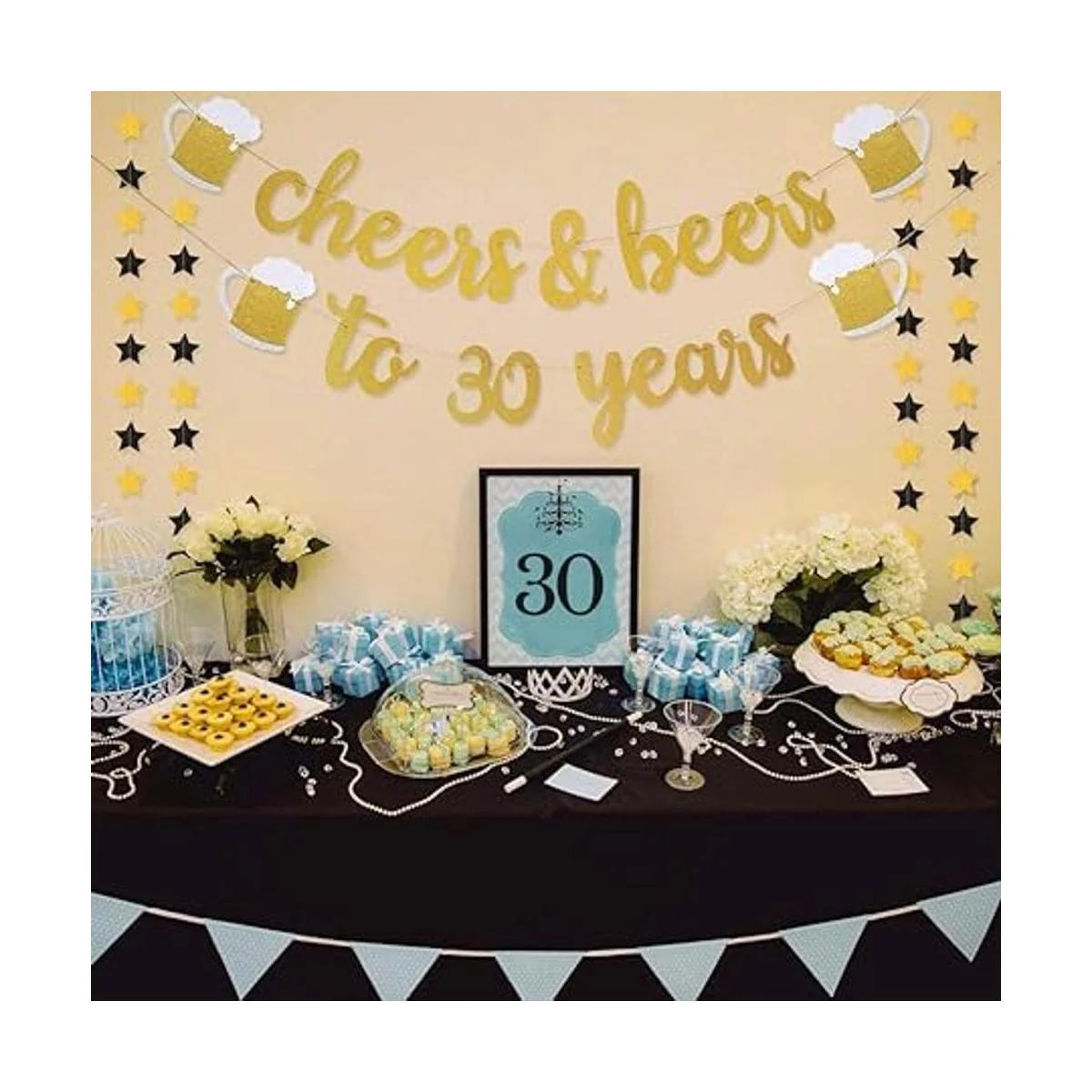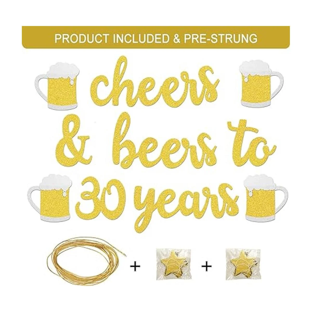 Preencordado: gran decoración: el paquete incluye: 1 pancarta dorada de alegría y cervezas a 30 años 2 guirnaldas de pancartas de estrellas
