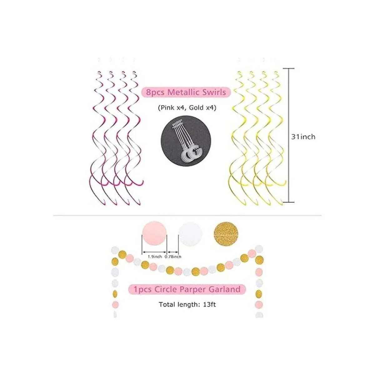 Lo que obtienes: 1 pancarta de feliz cumpleaños, 6 bolas de papel de panal, 1 guirnalda de papel circular, 8 remolinos metálicos colgantes y un servicio al cliente amigable.