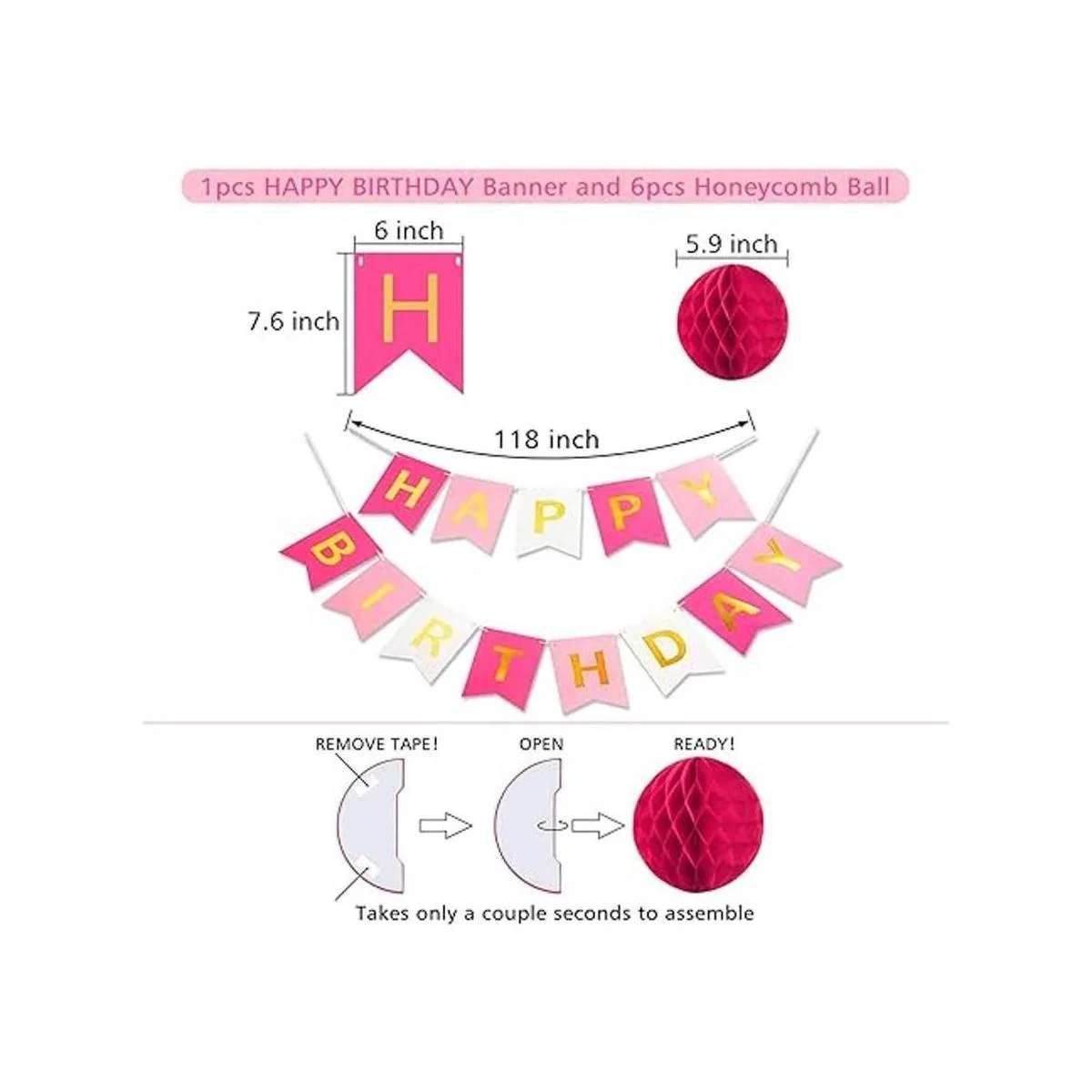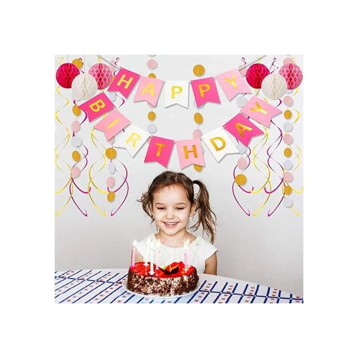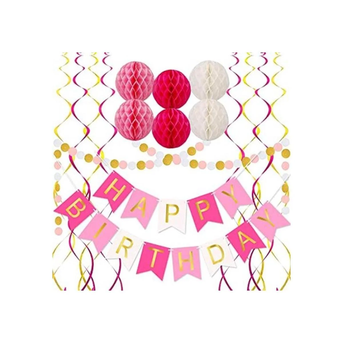 Decoraciones de cumpleaños rosas con pancarta de feliz cumpleaños, bolas de panal de papel, guirnalda circular y decoración de remolinos colgantes, decoraciones de fiesta de cumpleaños