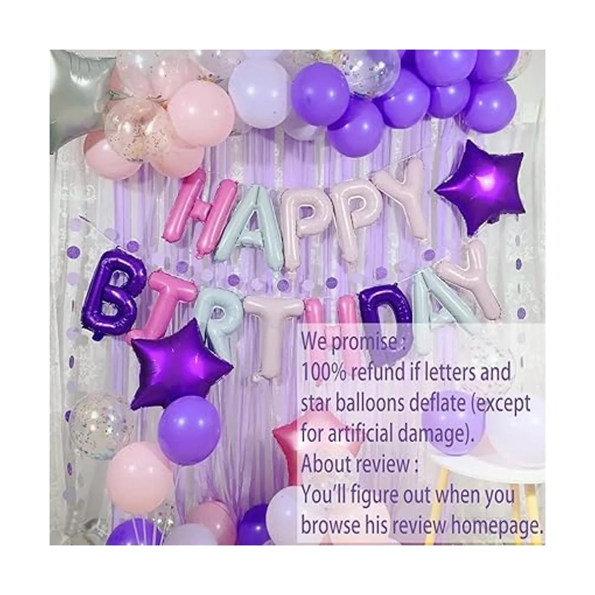 Lo que obtienes: incluye: globos de papel de aluminio, 4 globos de estrella, 20 globos morados y rosados, 10 globos de confeti, adornos de pastel morados, 8 serpentinas de papel y guirnalda de puntos circulares.