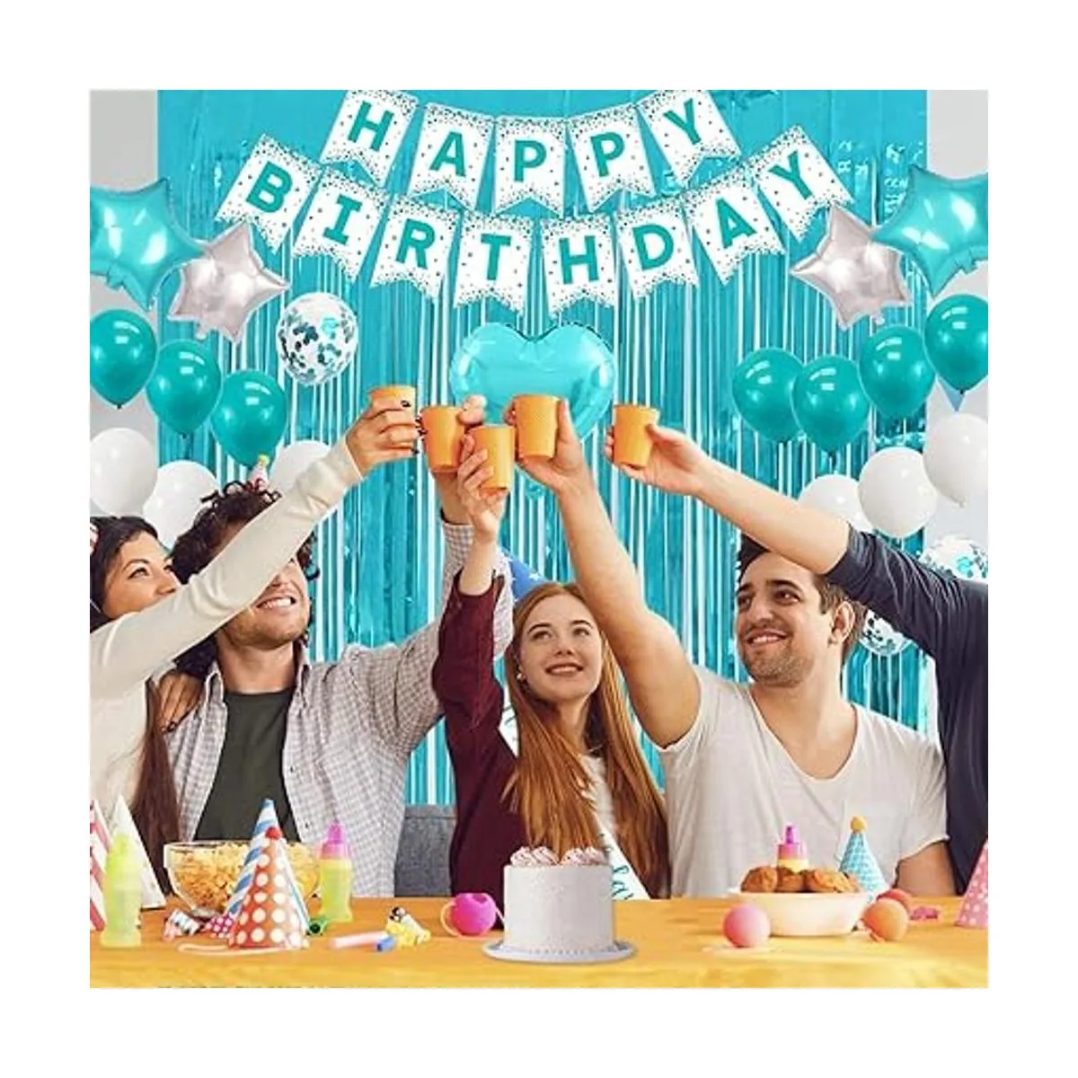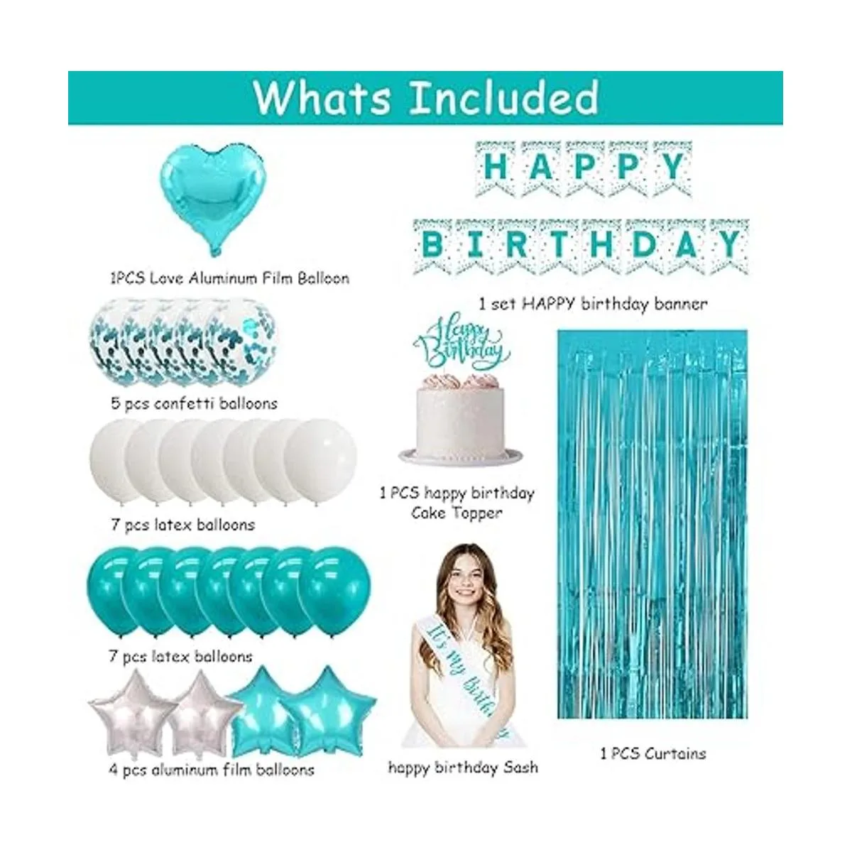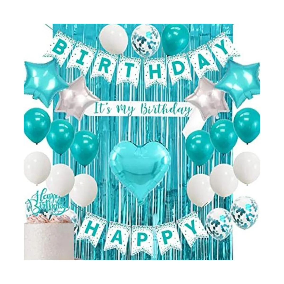 Lo que obtienes: como se muestra en la imagen, la decoración de cumpleaños: 1 pancarta de feliz cumpleaños, 1 decoración para pastel de feliz cumpleaños, 1 banda, 1 globo de corazón de aluminio, 4 globos de estrella de aluminio 2 verde azulado, 2 plateados, 7 globos blancos, 5 globos de confeti verde azulado, 7 globos azules azulado, 1 cortina de flecos de papel de aluminio verde azulado.