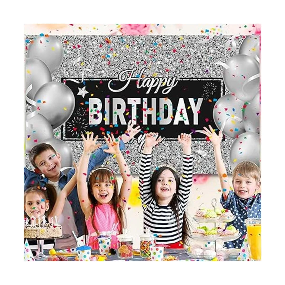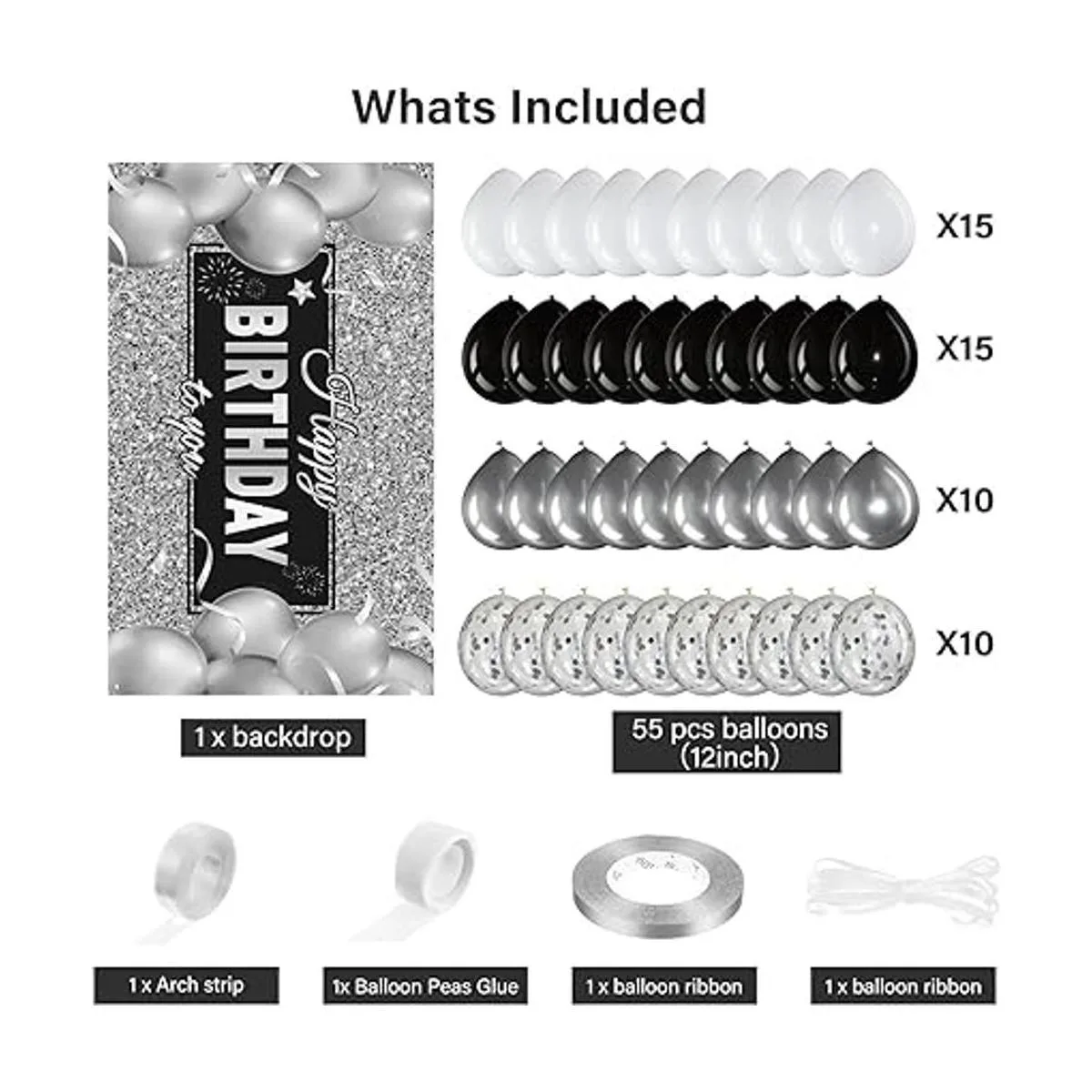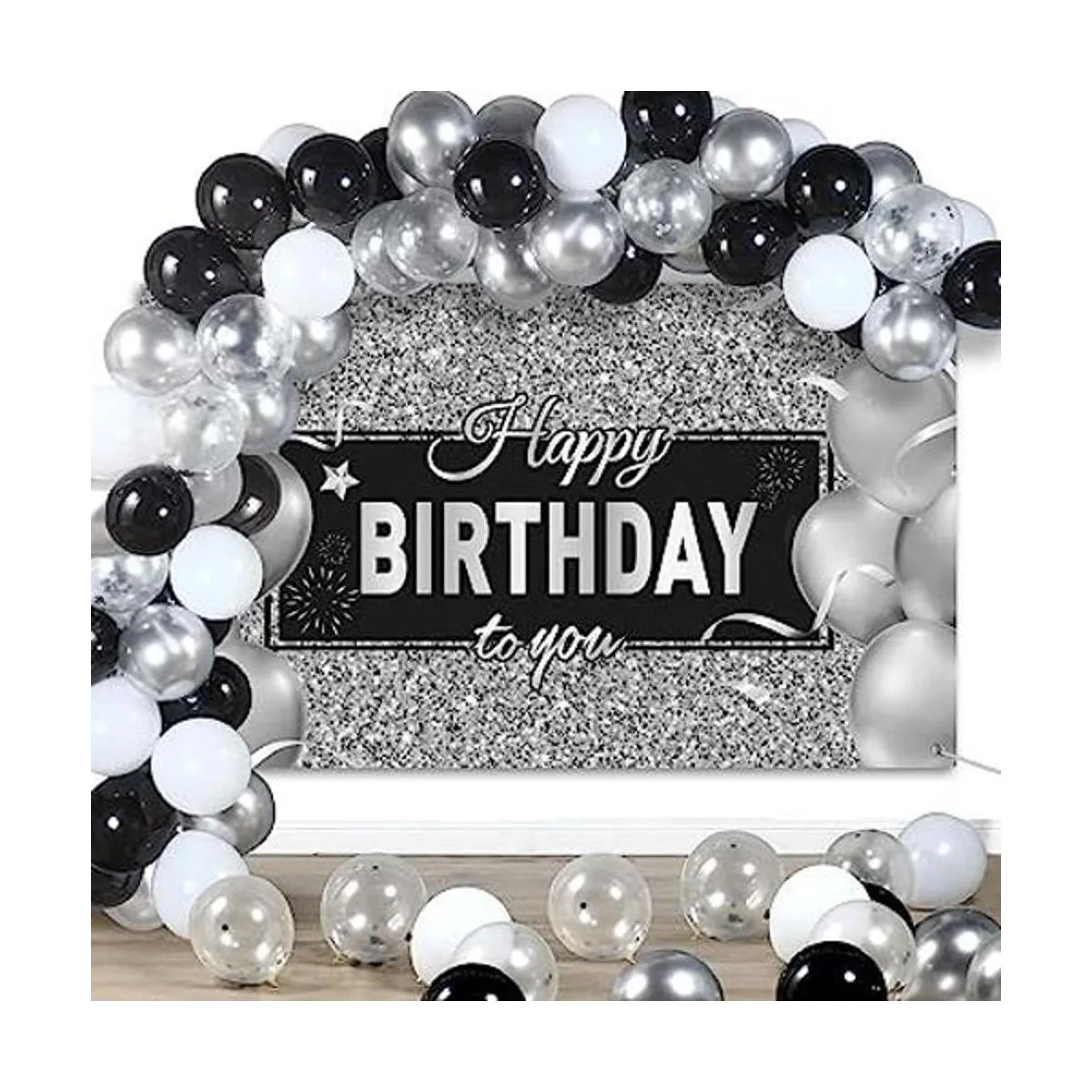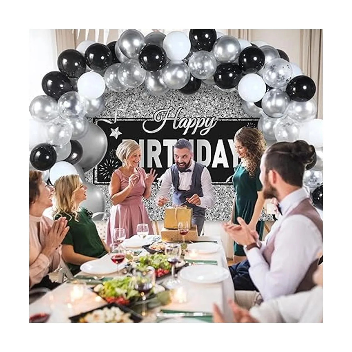 Decoraciones de fiesta de cumpleaños negras y plateadas, kit de guirnalda de arco de globos negros y plateados, pancarta de fondo de fotografía de cumpleaños color negro plateado para niños y adultos, suministros de decoración para fiestas de cumpleaños