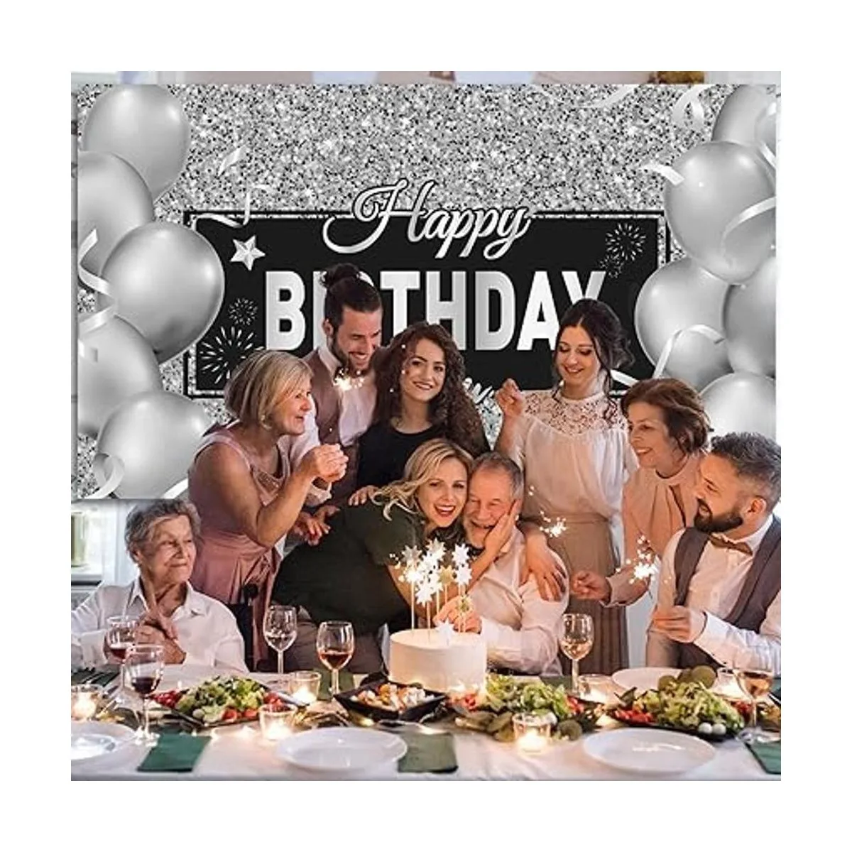 Amplia gama de aplicaciones: estas decoraciones de globos de cumpleaños negros y plateados pueden adornar bien tu paisaje de fiesta de cumpleaños; al mismo tiempo, la pancarta de fondo se puede colgar en la pared y puerta como suministros de fiesta, muy adecuado para fondos de fotografía de fiesta; puedes dejar que tus invitados dibujen, firmen o dejan una bendición, y tomar una foto con su obra de arte, dejando recuerdos felices para tus amigos y familiares