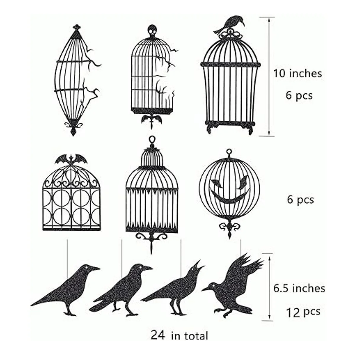 El paquete incluye: 24 unidades. de recortes de jaula negra con purpurina y cuervo, 12 jaulas de pájaros en 6 diseños y 12 cuervos en 4 diseños. La jaula más grande mide 10 pulgadas y el pájaro más grande es de 6.5 pulgadas de altura. Incluye un rollo de hilo negro y 50 piezas de pegamento de puntos para colgar y fijar.