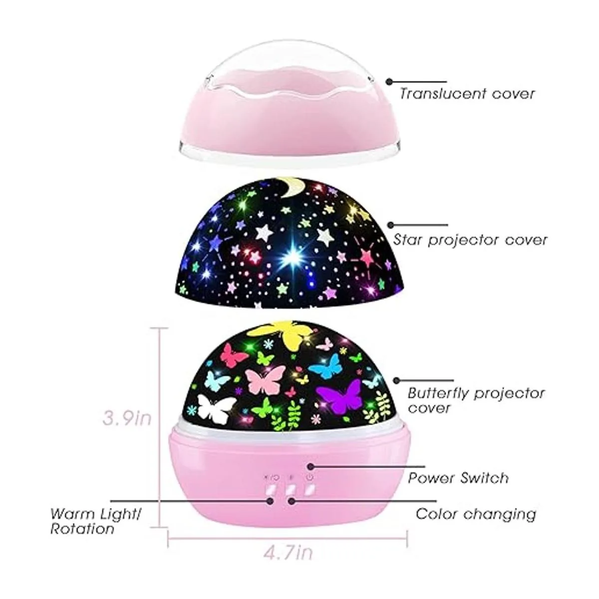 Multifuncional: proporciona tres temas de proyección, mariposa, estrella y luz cálida. Rotación de 360 grados y 16 combinaciones de colores, proporcionan más interés a la proyección y el ambiente de la habitación, es una gran decoración de interiores y suministros de fiesta. Botón izquierdo, luz cálida o rotación; botón medio, cambio de color; botón derecho, abrir o cerrar.