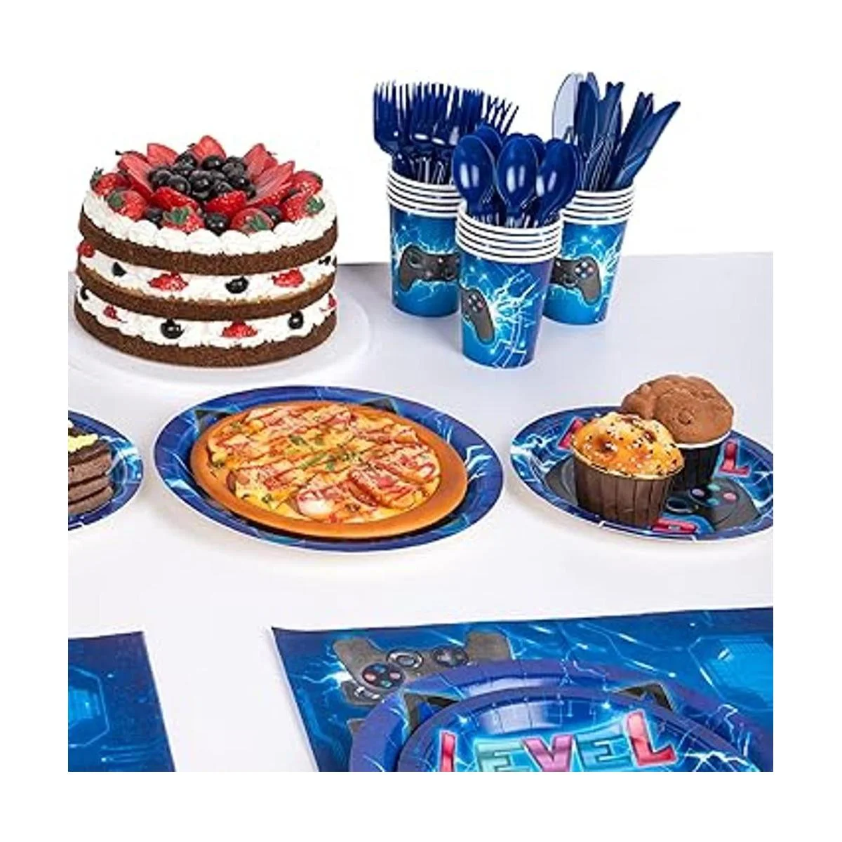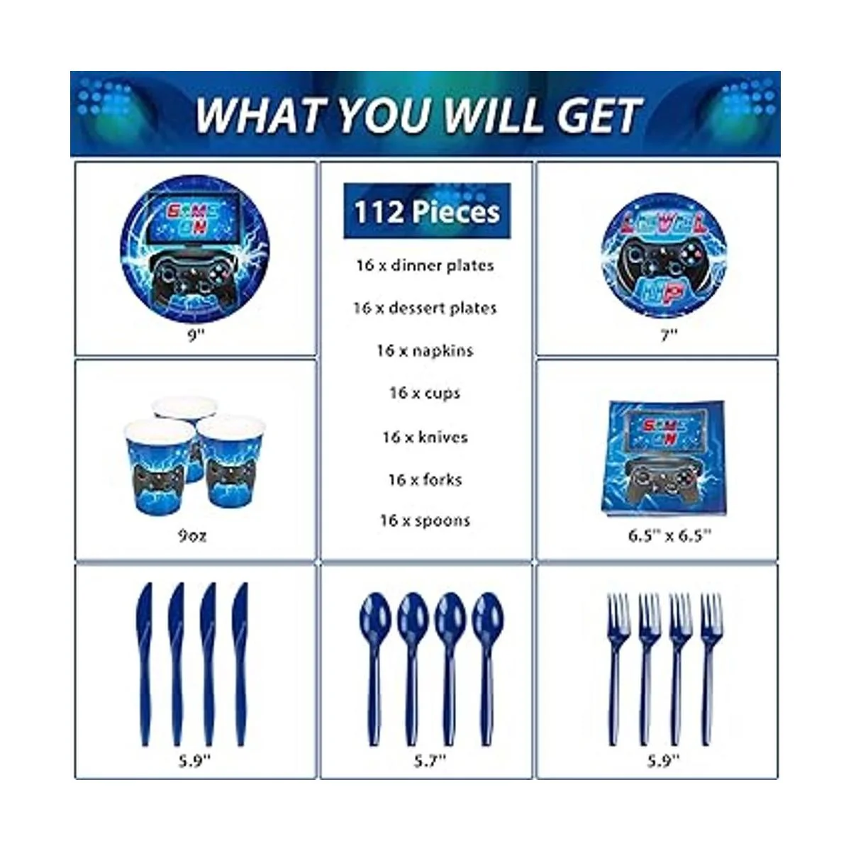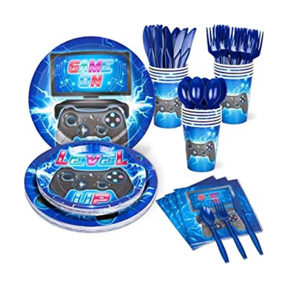 DECORLIFE Suministros de fiesta de videojuegos que sirven 16, suministros completos de fiesta de jugadores que incluyen platos de fiesta y servilletas, tazas y cuchillos, tenedores, cucharas, azul, 112 unidades en total para cumpleaños de niños