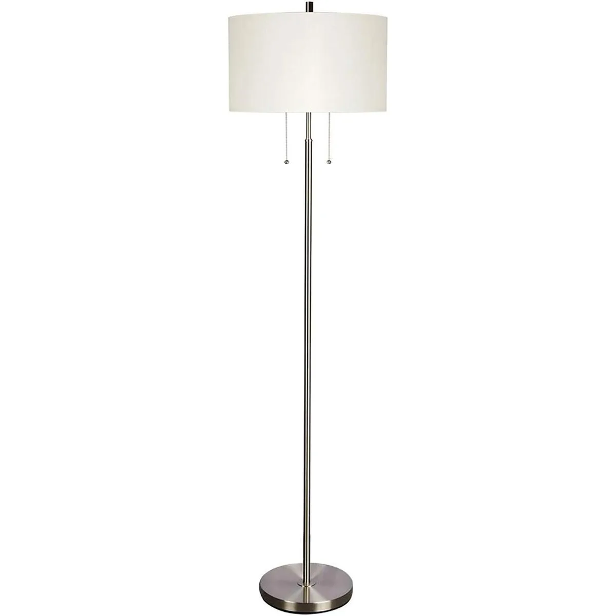 Lámpara de pie de metal de diseño minimalista pero contemporáneo: todo el cuerpo incluye tallo, base y cadena de tracción están hechos de metal y acabado de níquel cepillado. La pantalla de tambor de la moderna lámpara de pie está hecha de tela duradera. La base de metal pesada garantiza que sea segura incluso en habitaciones de niños o con mascotas alrededor