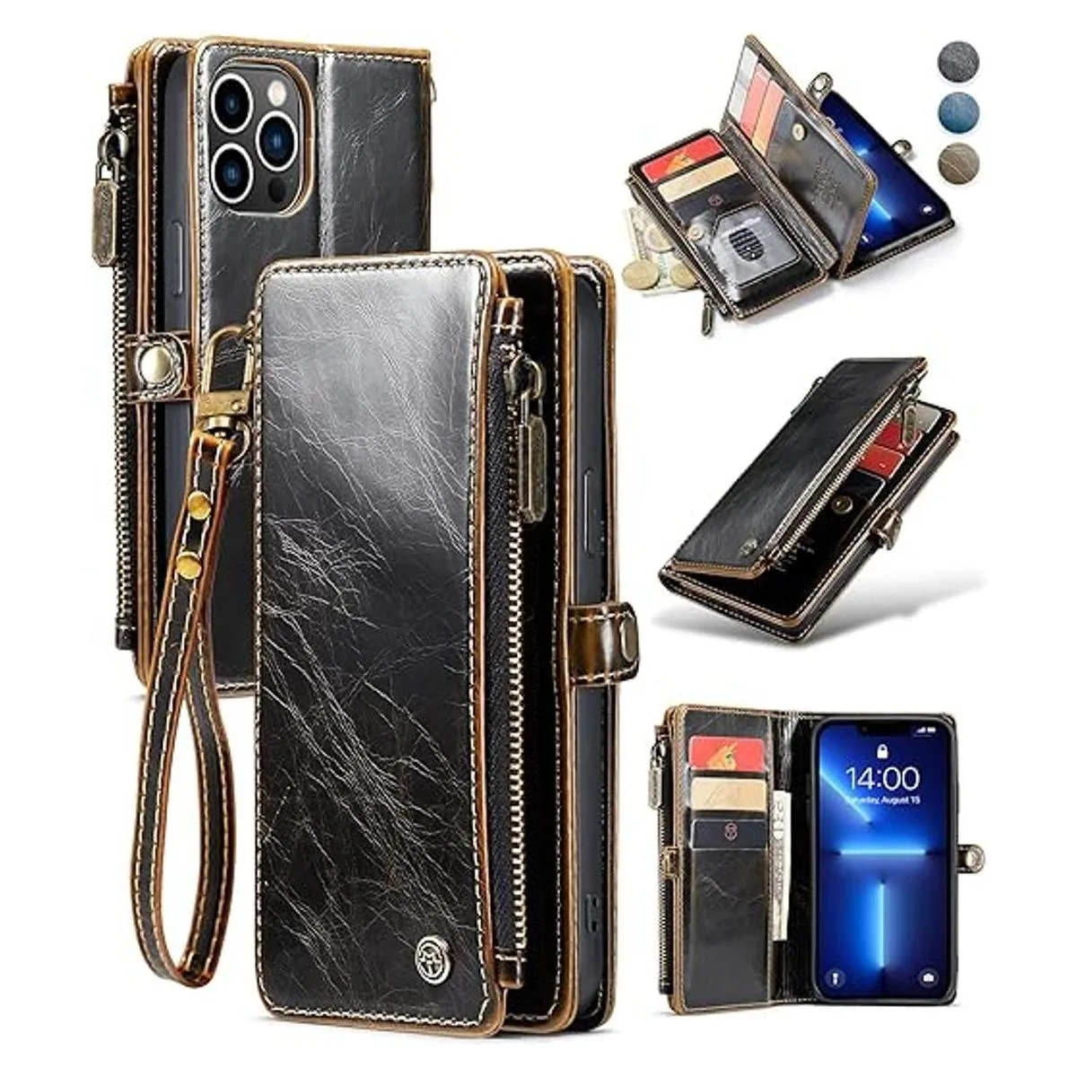 4. Ranuras para tarjetas, cremallera y pulsera: la funda para iPhone 13 Pro Max para mujeres y hombres incluye 10 tarjeteros 1 bolsa con cremallera 1 ranura para efectivo, sostiene tu identificación, tarjetas de crédito, licencia de conducir, facturas, monedas y un poco de dinero en efectivo sin problemas. La cremallera ha sido probada más de 5000 veces; con una correa de cordón extraíble, proporcionando un método de agarre opcional.