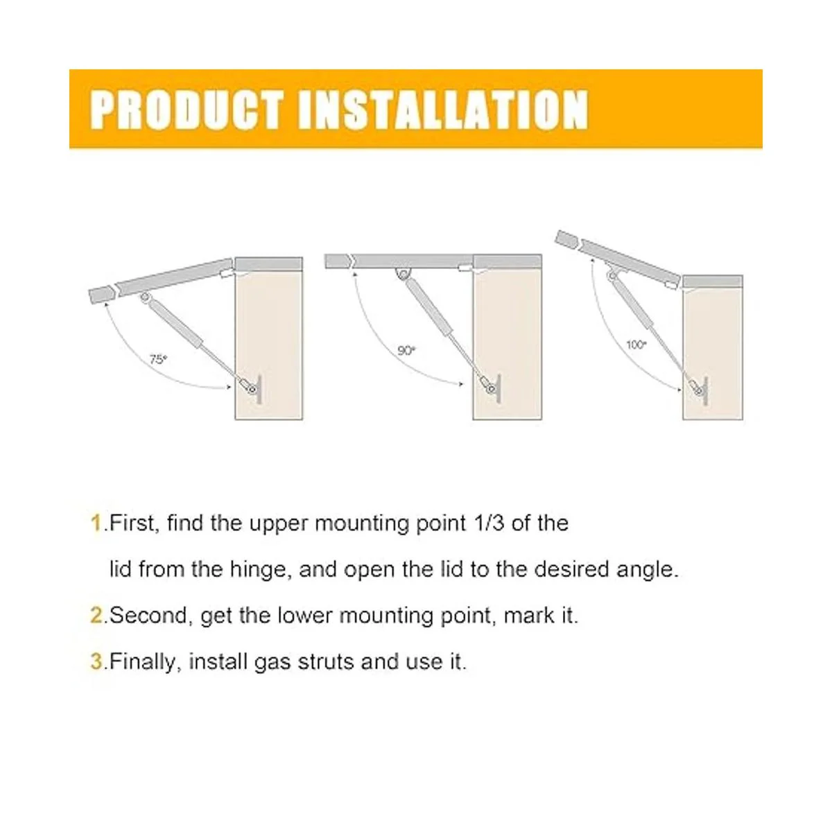 Aplicación: adecuado para usar en almacenamiento de cama de RV, puerta de tapa de caja de herramientas, tapa de gabinete ligera, puerta de escotilla de barco, caja de juguetes, tapa de banco, cubo de basura, etc. Nota: si el peso de la tapa es inferior a 22 libras o más de 30 libras, elige otros amortiguadores de presión.